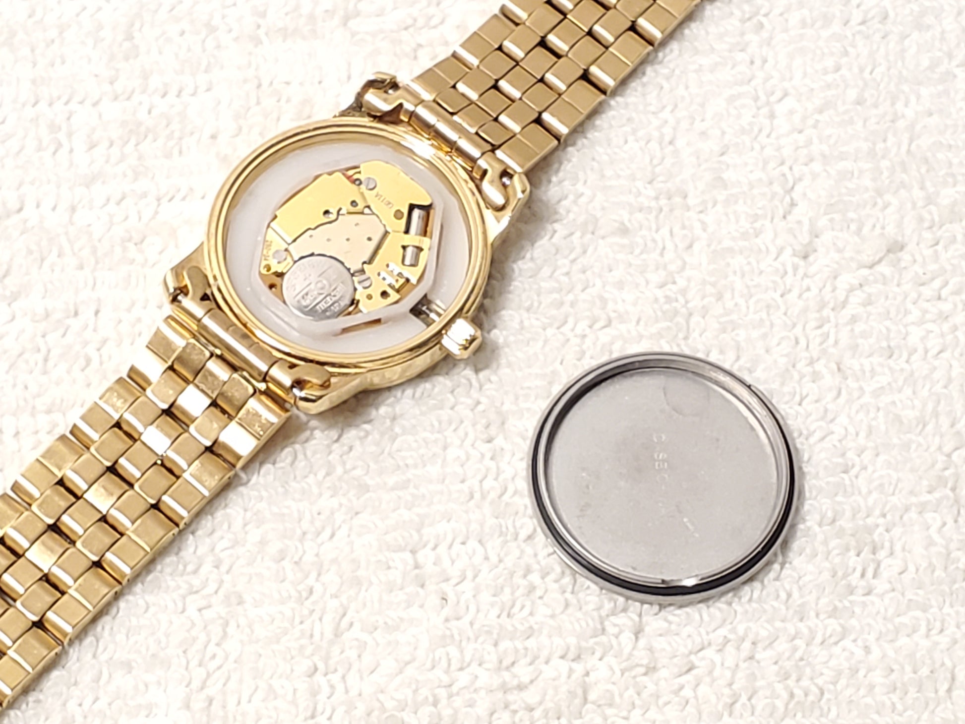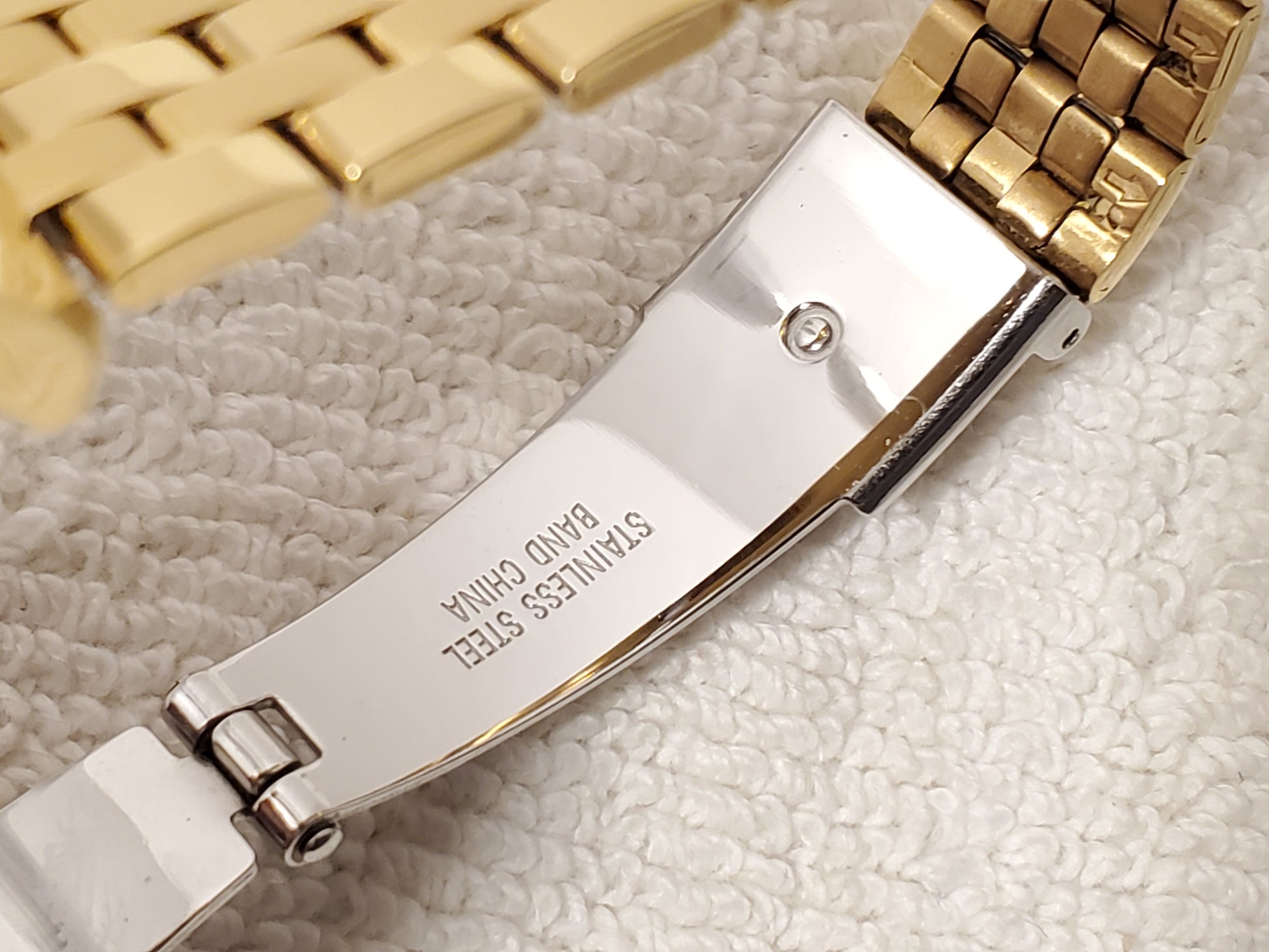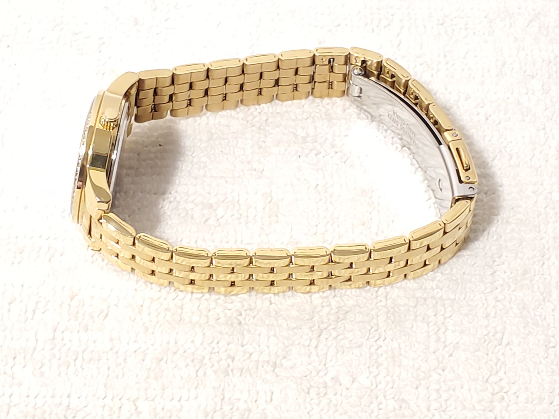 NO SCRATCHES OR SCUFFS ON MINERAL CRYSTAL GLASS WINDOW. ONE OWNER. GENTLY USED. VERY GOOD CONDITION COSMETICALLY. New MAXELL battery installed OCTOBER 2025, tested, inspected, and witnessed, everything works, fully functional as manufactured, smoke and pet free, CLEAN, DETAILED, POLISHED, BRIGHT, SHINY, ready to wear. Wrist fit comfortable 7". Max 7 1/4" tight fit can adjust to fit a smaller size. Photos may be brighter than the original color. Case size 26m, thickness 7m, Swarovski Crystals fixed bezel, mother pearl dial with Swarovski Crystals, date indicator, gold tone, stainless steel, water resistance 50 meters, fold over secure snap clasp push button deployment, removable links.