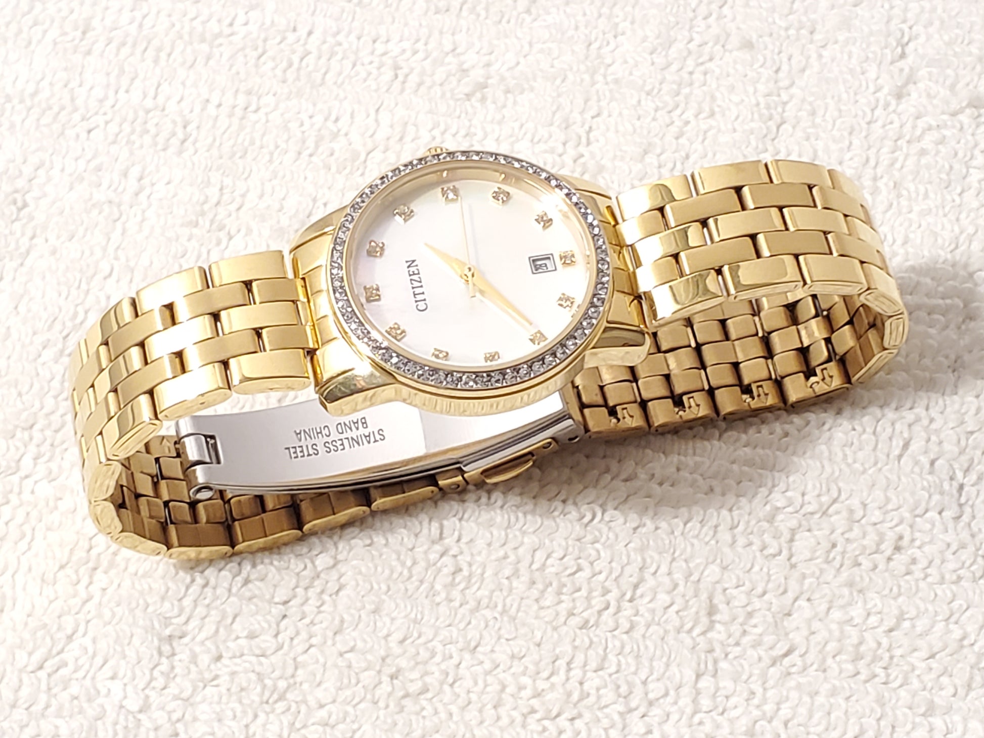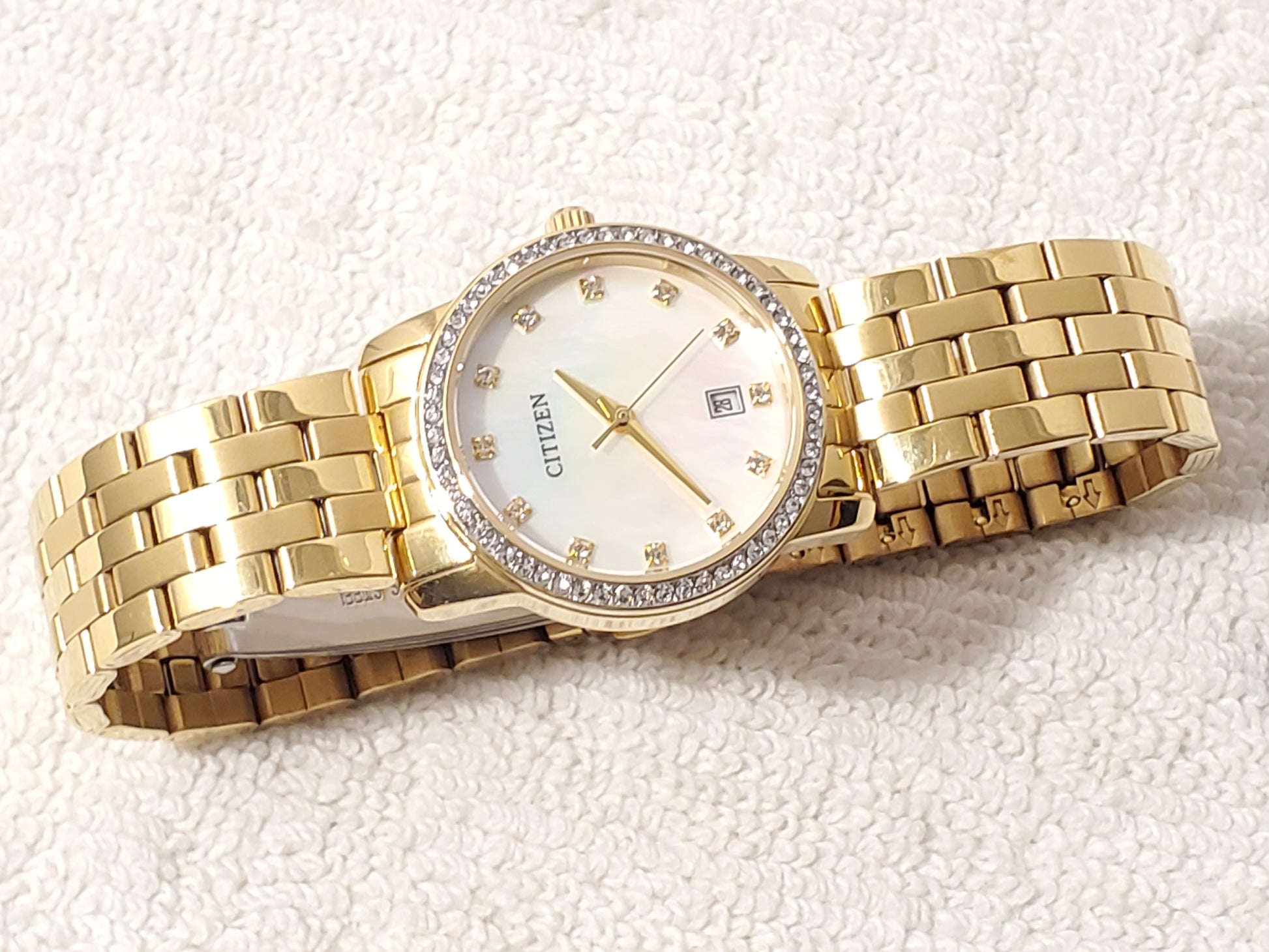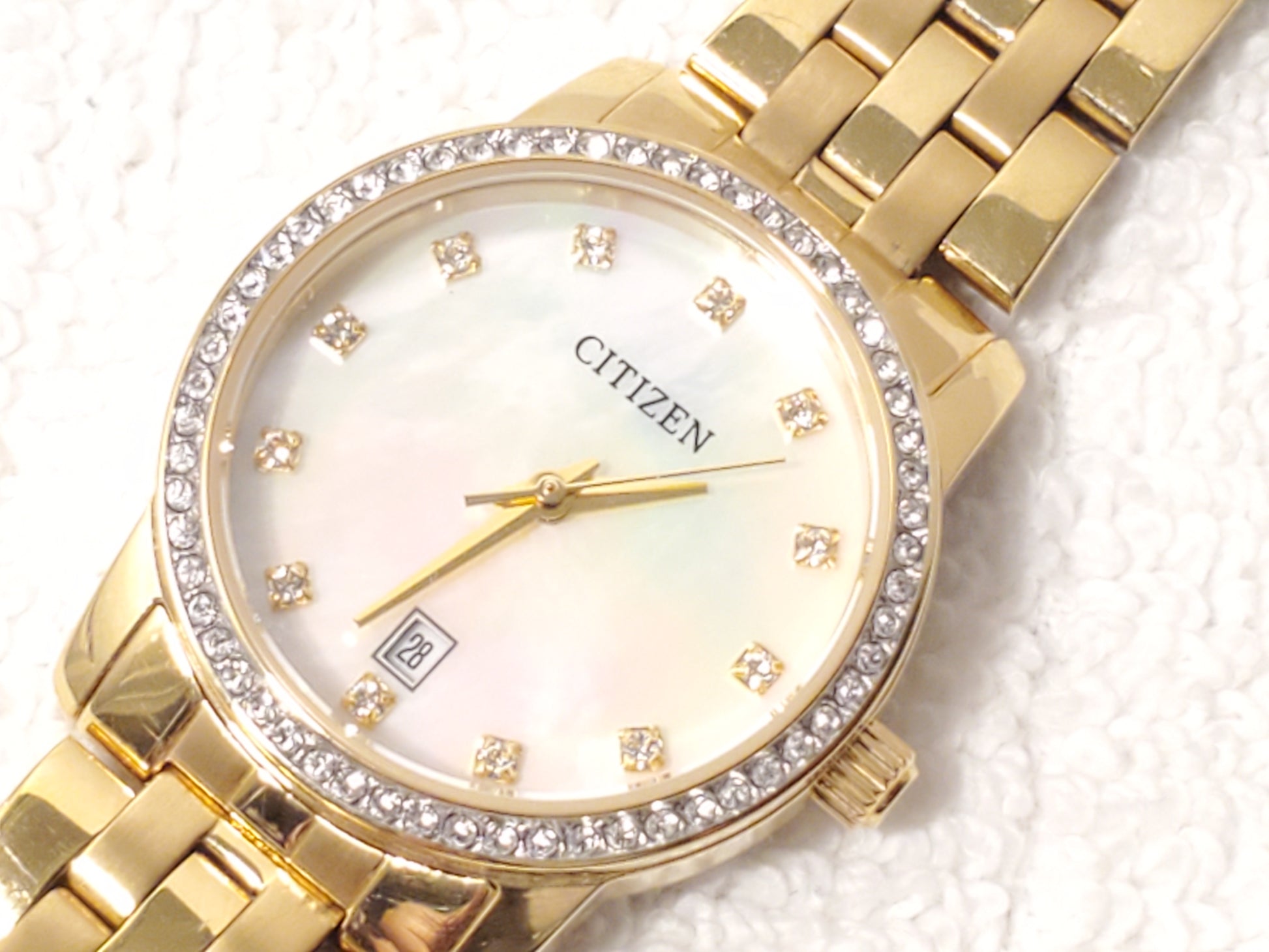 Citizen Womens Gold Tone Stainless Steel Quartz Watch Mother Pearl Dial Crystals