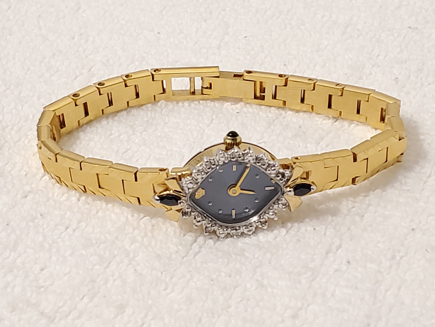 Three minor tiny to very small ghost to very light scratches on mineral crystal glass window nothing major. ONE OWNER. GENTLY USED. VERY GOOD CONDITION COSMETICALLY. New ENERGIZER battery installed DECEMBER 2024, tested, inspected, and witnessed, everything works, fully functional as manufactured, smoke and pet free, CLEAN, DETAILED, POLISHED, BRIGHT, SHINY, ready to wear. Lovely appearance, radiant. Wrist fit comfortable 5 1/2". Max 5 3/4" tight fit can adjust to fit a smaller size. Photos may be brighter than the original color. Case size 18m, thickness 7m, eight diamonds bezel with 2 black sapphire crystals, black onyx tip crown, blue dial, marquise shape case, gold plated, one jewel, swiss, removable links, jewelry clasp, stainless steel.