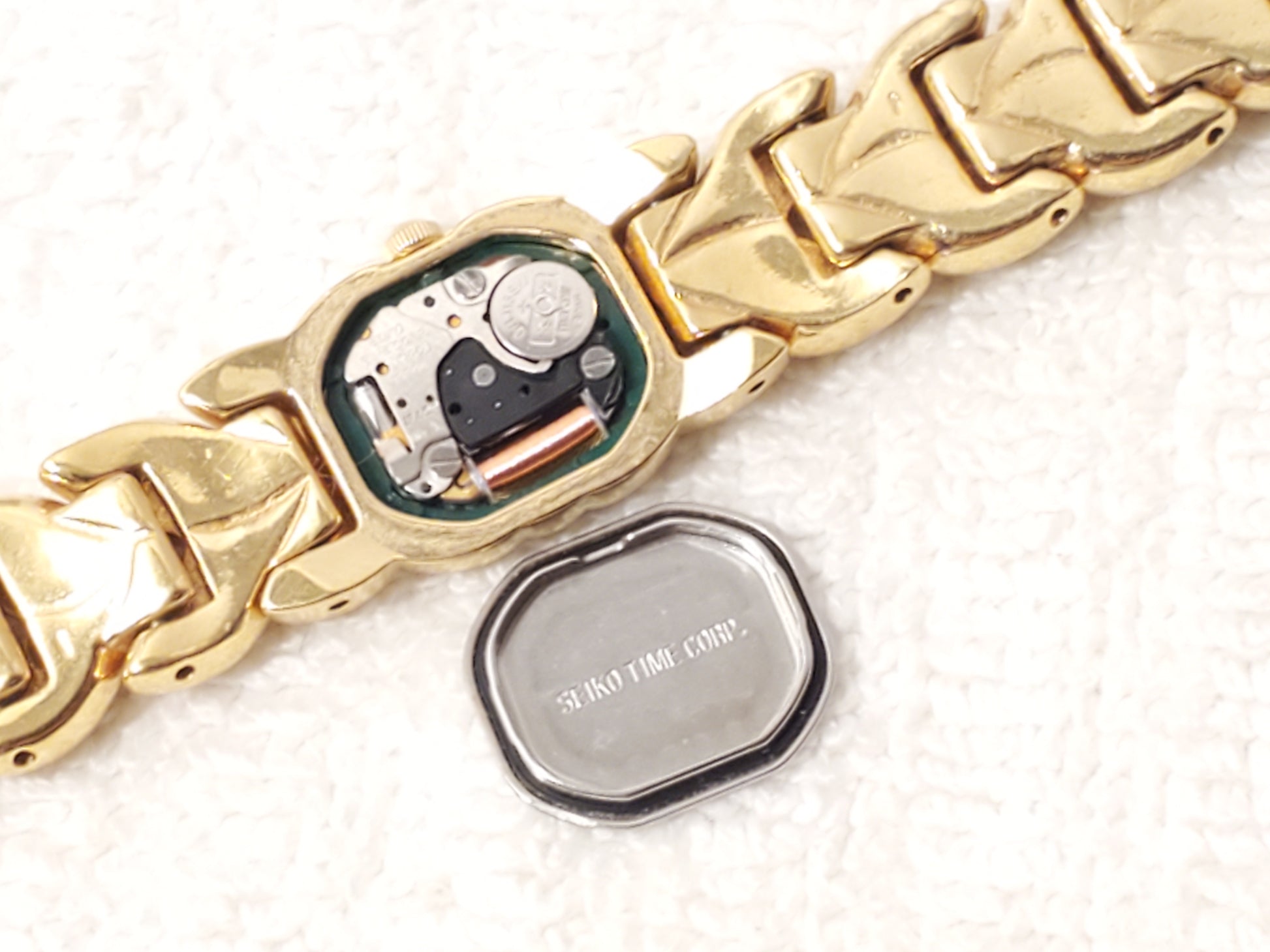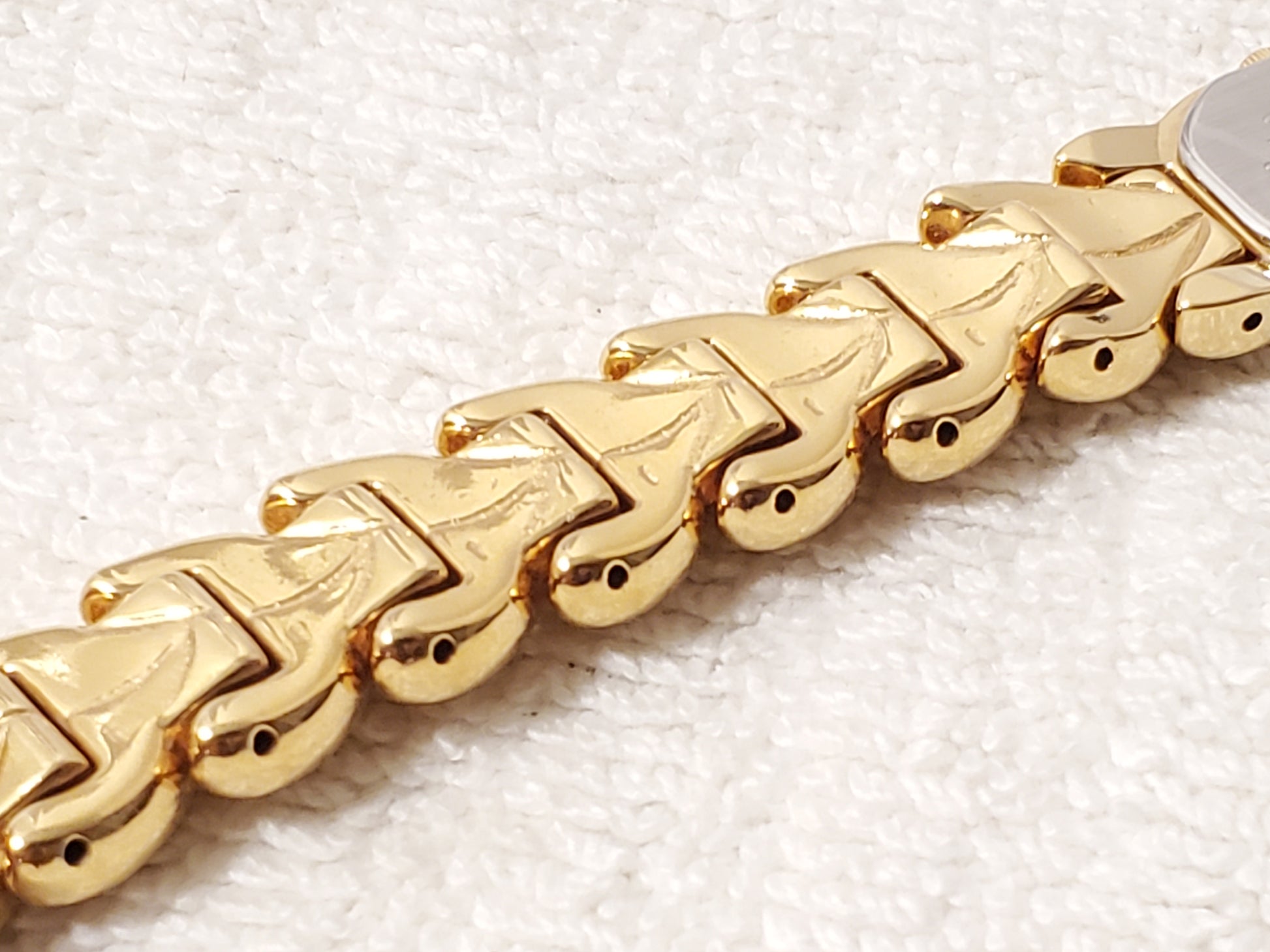 NO SCRATCHES OR SCUFFS ON THICK MINERAL CRYSTAL GLASS WINDOW. ONE OWNER. GENTLY USED. May see ghost to lite scratches on back plate and bracelet all minor. NO FADING GUARANTEED. New MAXELL battery installed AUGUST 2025, tested, inspected, and witnessed, everything works, fully functional as manufactured, smoke and pet free, CLEAN, DETAILED, POLISHED, BRIGHT, SHINY, ready to wear. Wrist fit comfortable 5 3/4". Max 6" tight fit can adjust to fit a smaller size. Photos may be brighter than the original color. Case size 14m, thickness 6m, textured dial, leafy bracelet, base metal, stainless steel, gold tone, vintage 1990's, jewelry clasp, removable links.