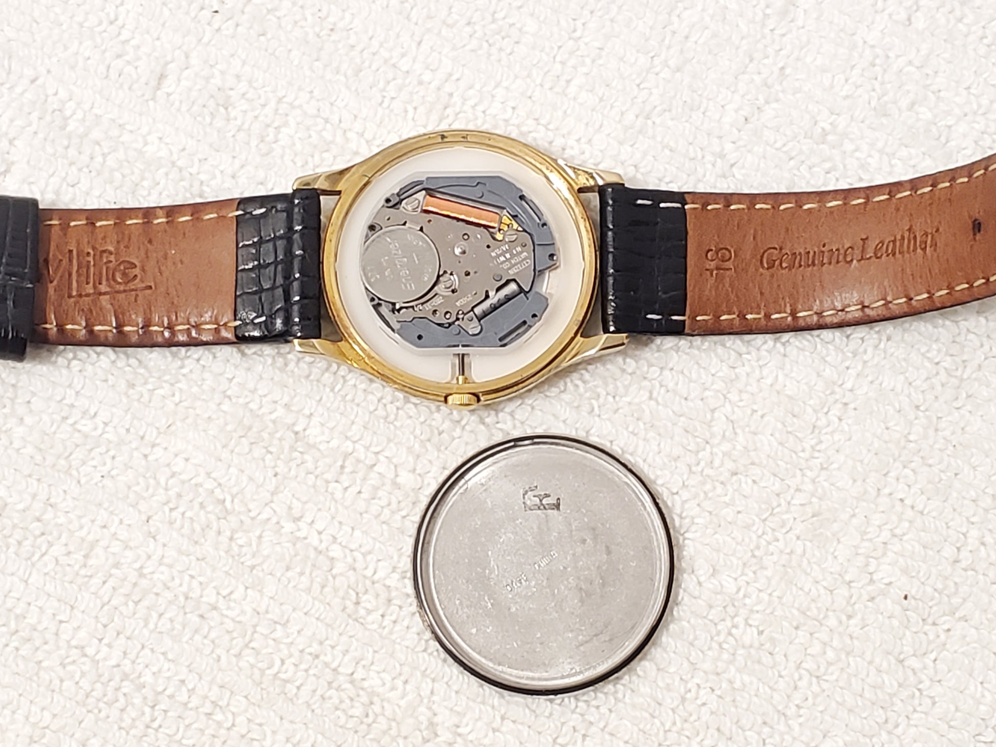 Vintage Citizen CQ Men's Day Date Gold Tone Watch White Dial Black Leather Strap