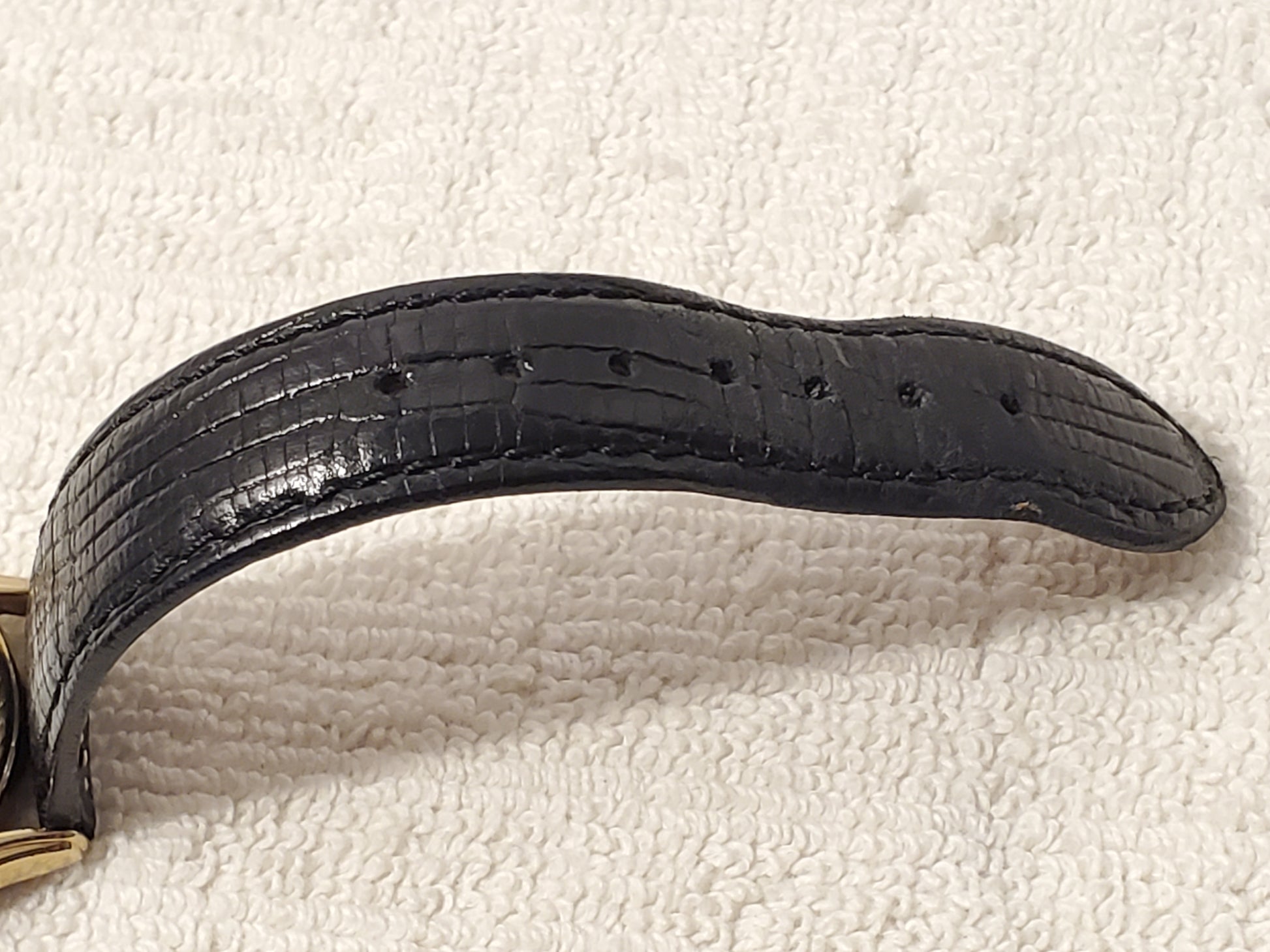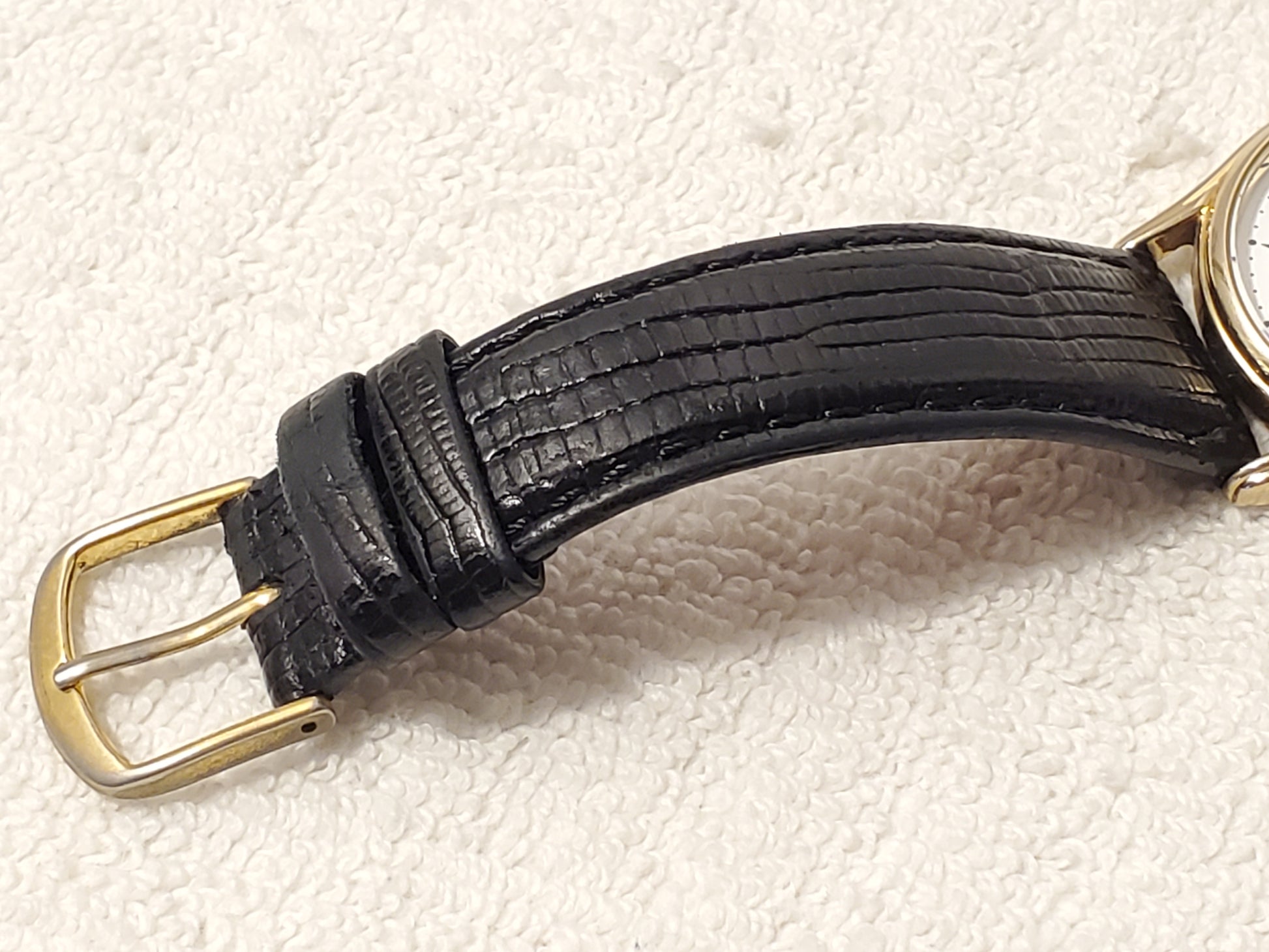 NO SCRATCHES OR SCUFFS ON MINERAL CRYSTAL GLASS WINDOW. ONE OWNER. May see ghost to lite scratches on back plate, case, bezel all minor. Lite fading on buckle. Lite to medium wear leather strap. New ENERGIZER battery installed AUGUST 2025, tested, inspected, and witnessed, everything works, fully functional as manufactured, smoke and pet free, CLEAN, DETAILED, POLISHED, BRIGHT, SHINY, ready to wear. Wrist fit up to 7 1/4" max tight fit can adjust to fit a smaller size. Photos may be brighter than the original color. Case size 34m, thickness 7m, white dial, day date indicator, vintage 1980's, gold tone, stainless steel, black leather strap, Citizen CQ.