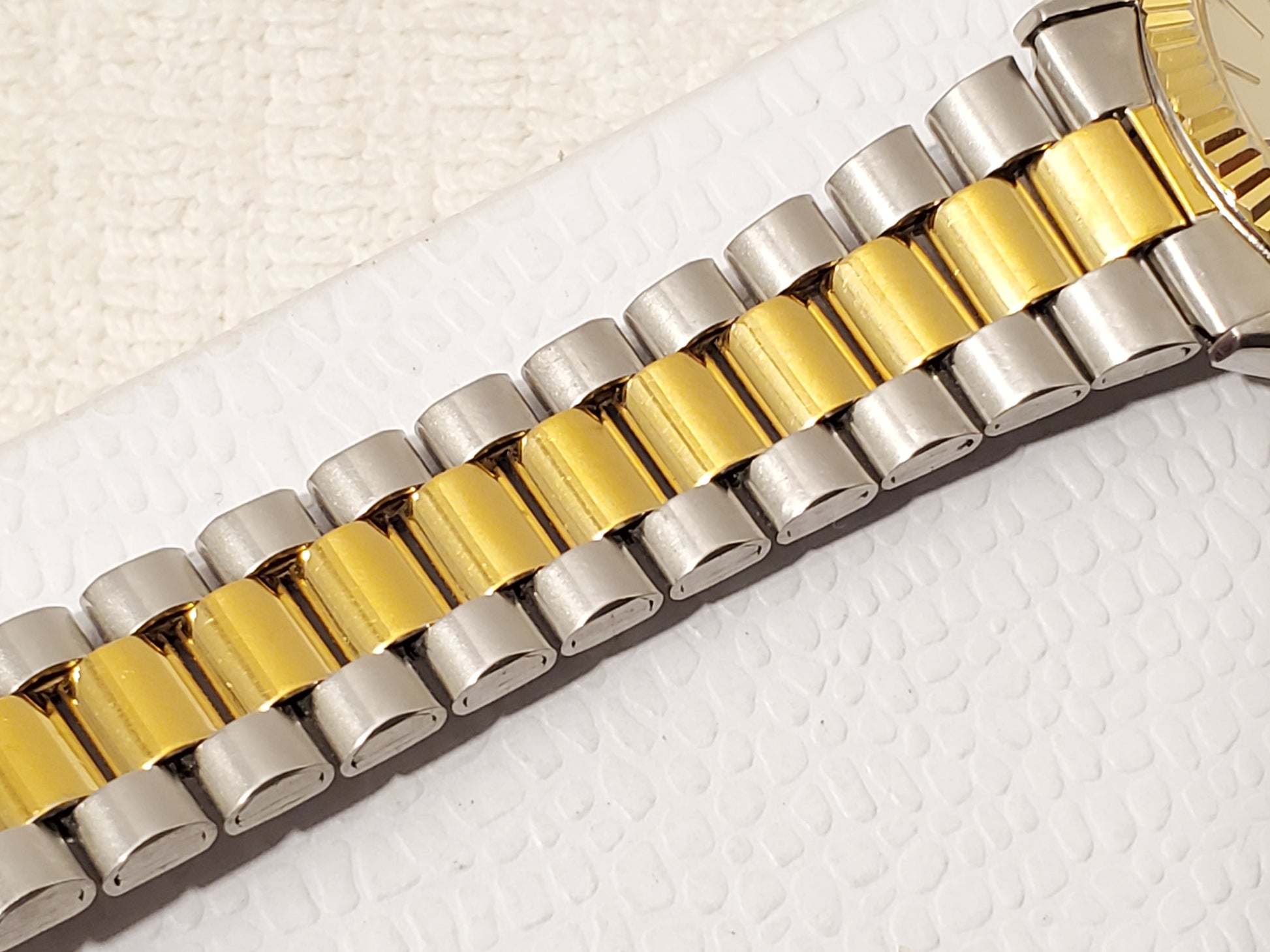 NO SCRATCHES OR SCUFFS ON MINERAL CRYSTAL GLASS WINDOW. ONE OWNER. May see ghost to lite scratches on back plate, bracelet, clasp all minor. New ENERGIZER battery installed AUGUST 2025, tested, inspected, and witnessed, everything works, fully functional as manufactured, smoke and pet free, CLEAN, DETAILED, POLISHED, BRIGHT, SHINY, ready to wear. Wrist fit comfortable 7 3/4". Max 8" tight fit can adjust to fit a smaller size. Photos may be brighter than the original color. Case size 35m, thickness 7m, champagne dial, day date indicator, luminous hands and indexes, fluted presidential fixed bezel, stainless steel, gold tone, screwback plate, gold plated movement, vintage 1980's, president bracelet style, removable links, micro adjustments, fold over secure snap clasp, water resistance 30 meters.