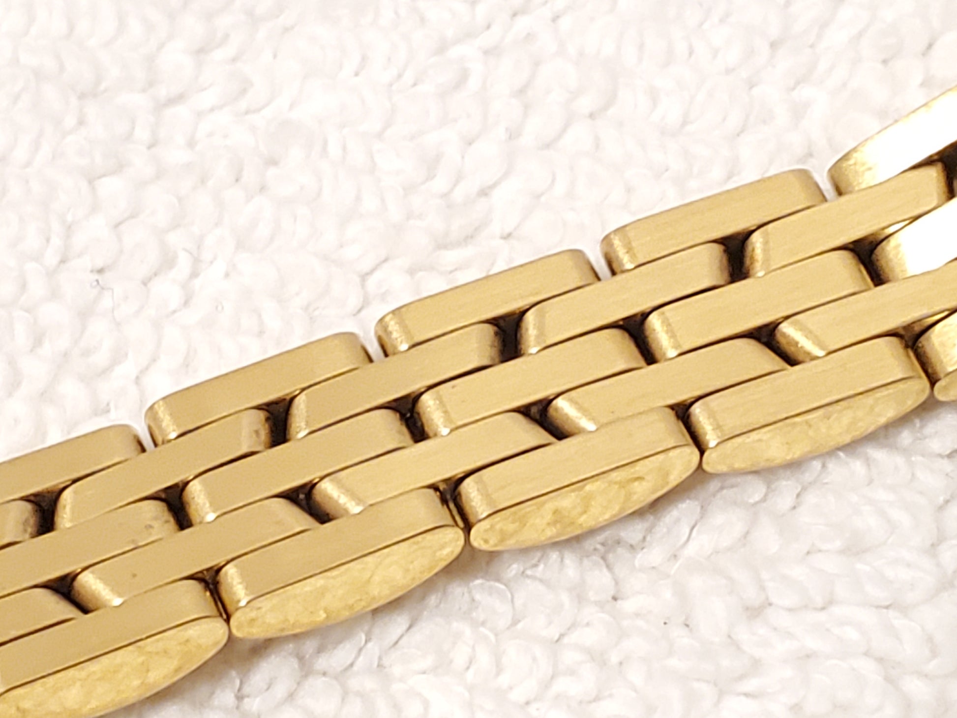 NO SCRATCHES OR SCUFFS ON MINERAL CRYSTAL GLASS WINDOW. ONE OWNER. GENTLY USED. May see ghost to lite scratches on back plate all minor. CHARGED IN SUNLIGHT JULY 2025, tested, inspected, and witnessed, everything works, fully functional as manufactured, smoke and pet free, CLEAN, DETAILED, POLISHED, BRIGHT, SHINY, ready to wear. Wrist fit comfortable 5 1/2". Max 5 3/4" very tight fit can adjust to fit a smaller size. Photos may be brighter than the original color. Case size 17m, thickness 6m, black dial, gold plated, stainless steel, vintage 1990's, removable links, push button deployment jewelry clasp, oval shape case, water resistance 10 meters, Japan Movement.