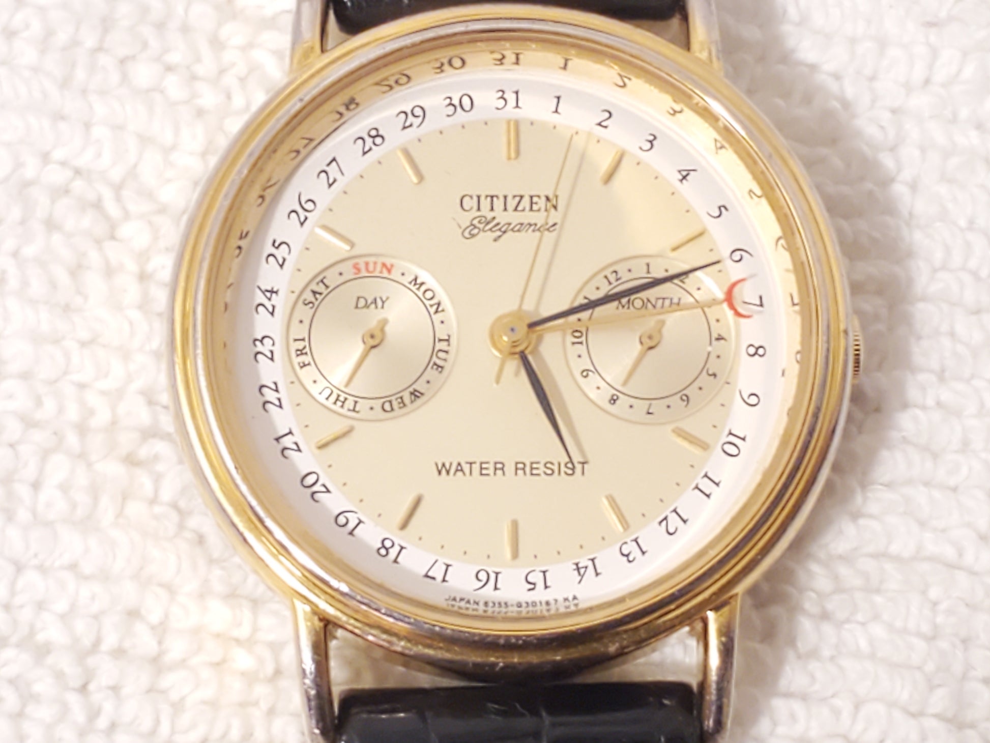 Vintage Citizen Elegance Men's Day Date Month Gold Tone Watch Black Leather Band