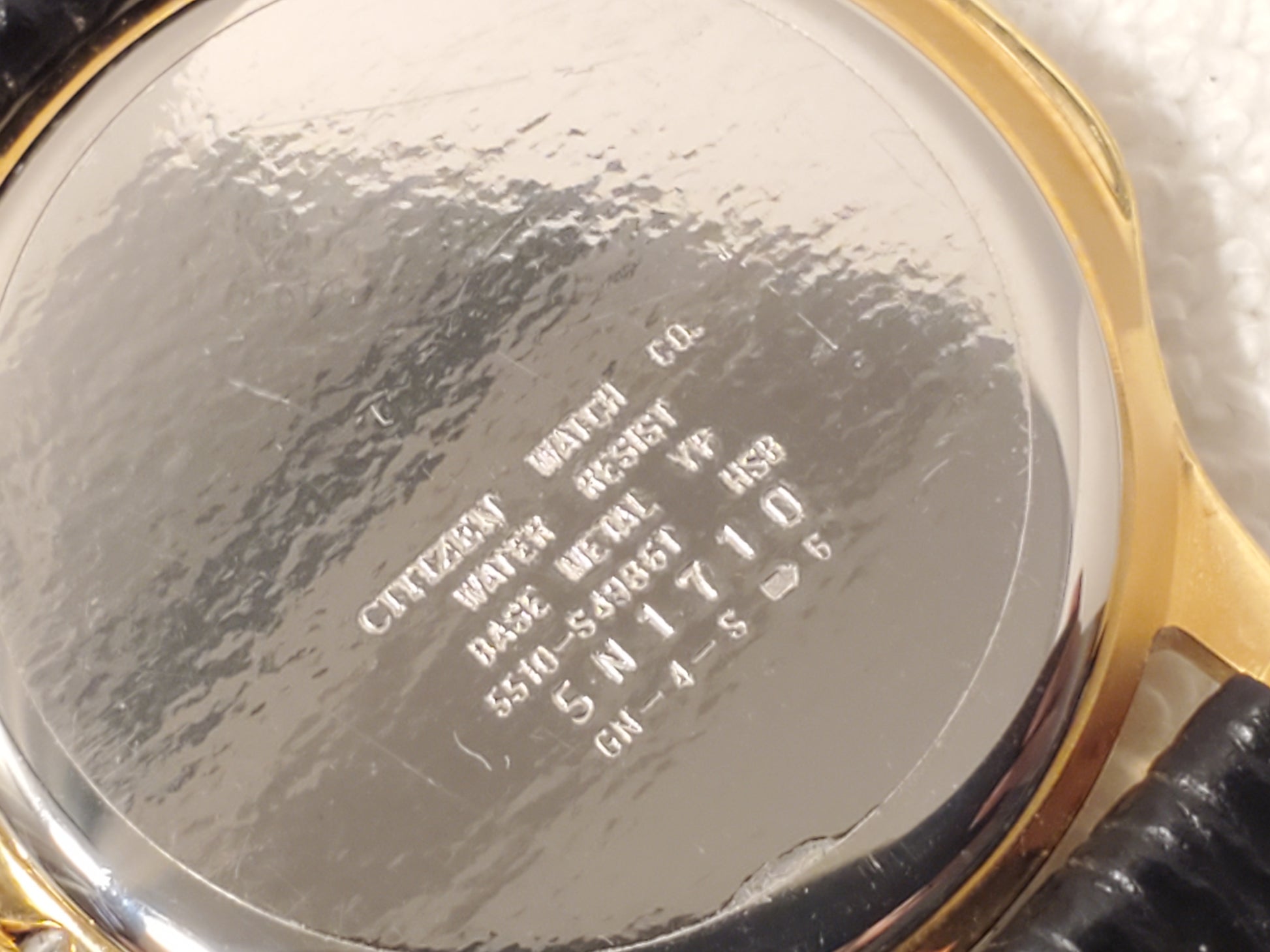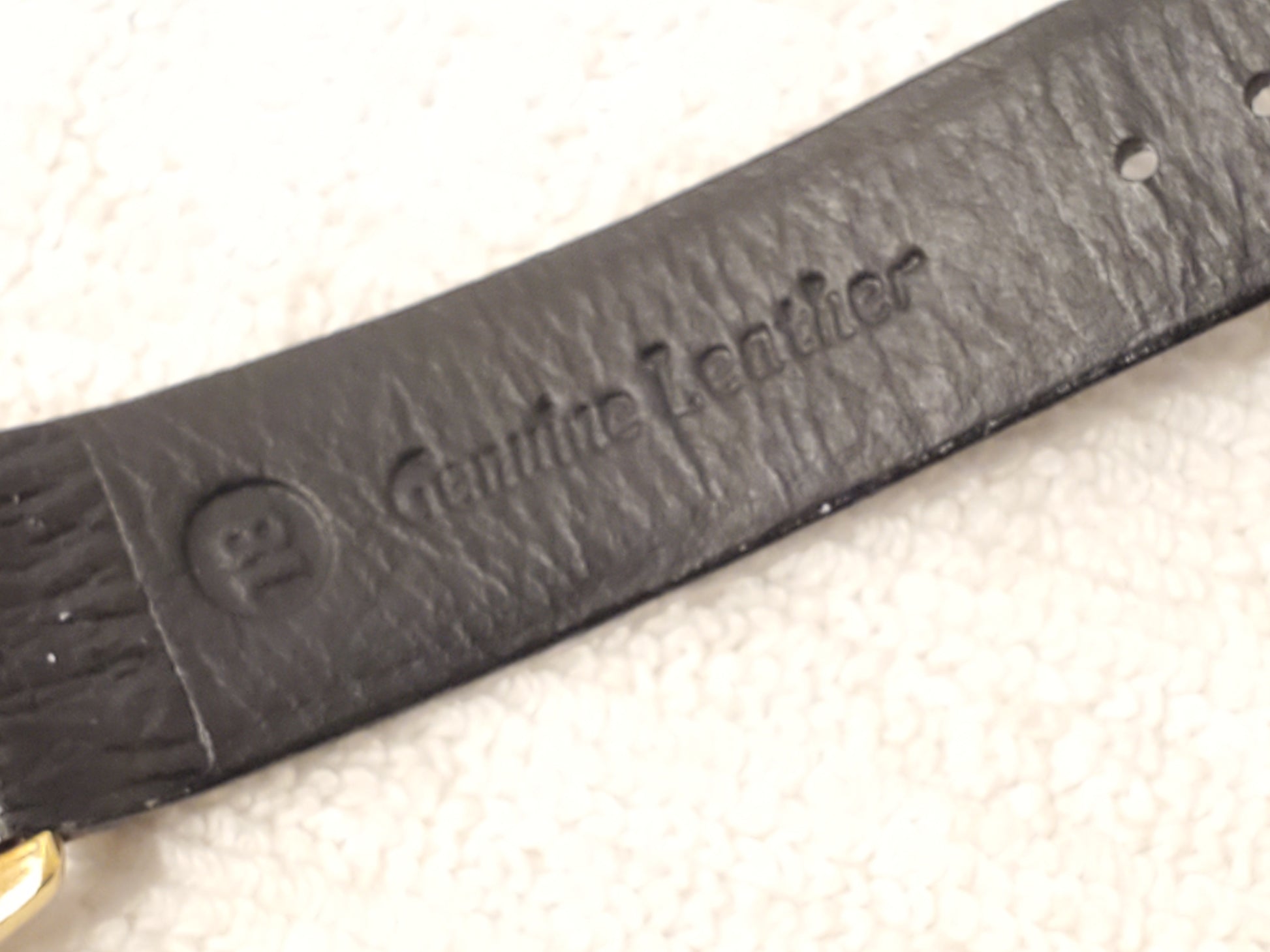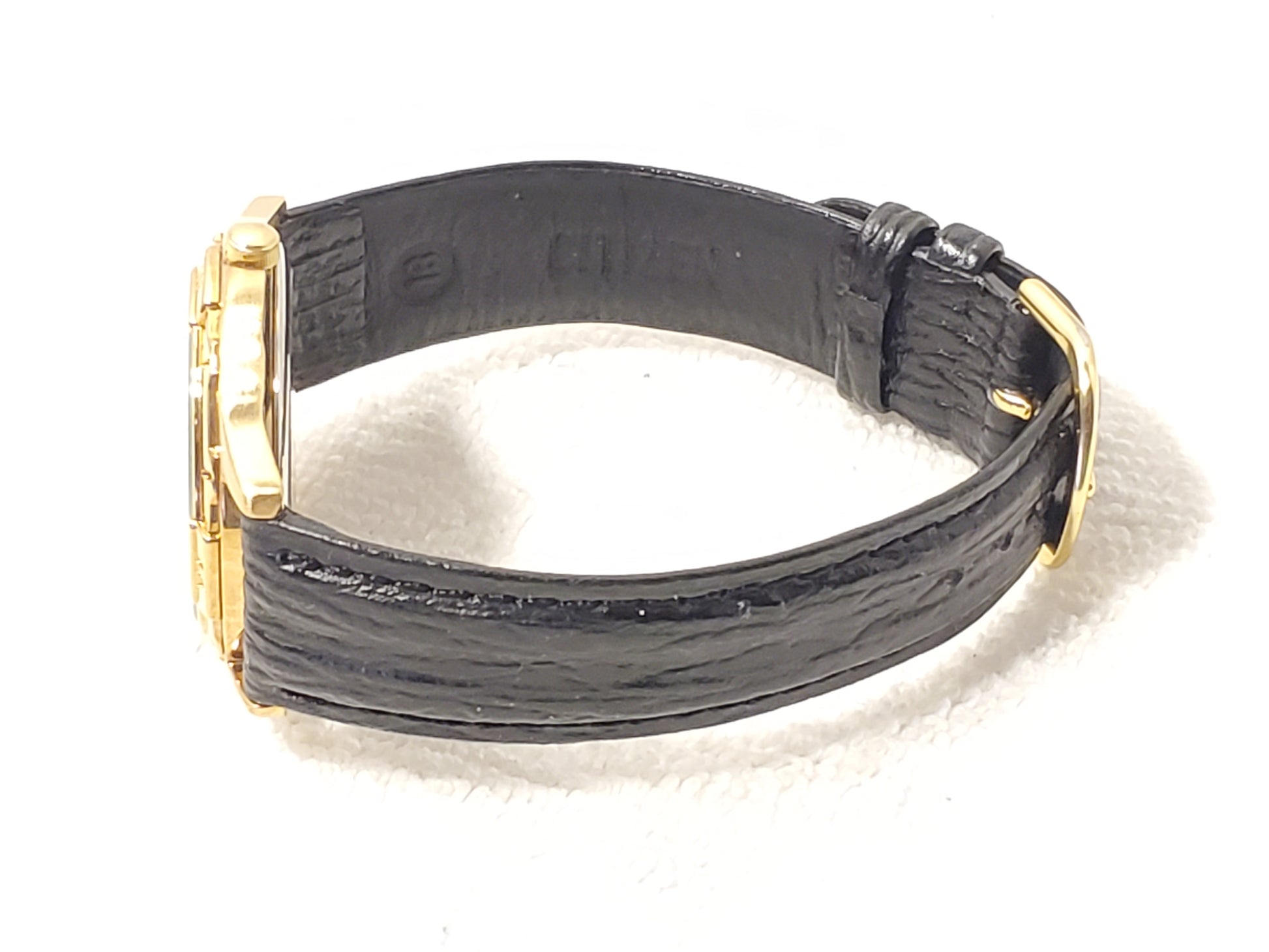NO SCRATCHES OR SCUFFS ON MINERAL CRYSTAL GLASS WINDOW. ONE OWNER. GENTLY USED. VERY GOOD CONDITION COSMETICALLY. STILL HAS PLASTIC PROTECTOR ON BACK PLATE. New ENERGIZER battery installed AUGUST 2025, tested, inspected, and witnessed, everything works, fully functional as manufactured, smoke and pet free, CLEAN, DETAILED, POLISHED, BRIGHT, SHINY, ready to wear. Wrist fit up to 7 3/4" max tight fit can adjust to fit a smaller size. Photos may be brighter than the original color. Case size 37m, thickness 7m, black dial, date indicator, luminous hands and indexes, roman numerals fixed bezel, crown guard, gold plated case and movement, black leather strap, water resistance 30 meters.