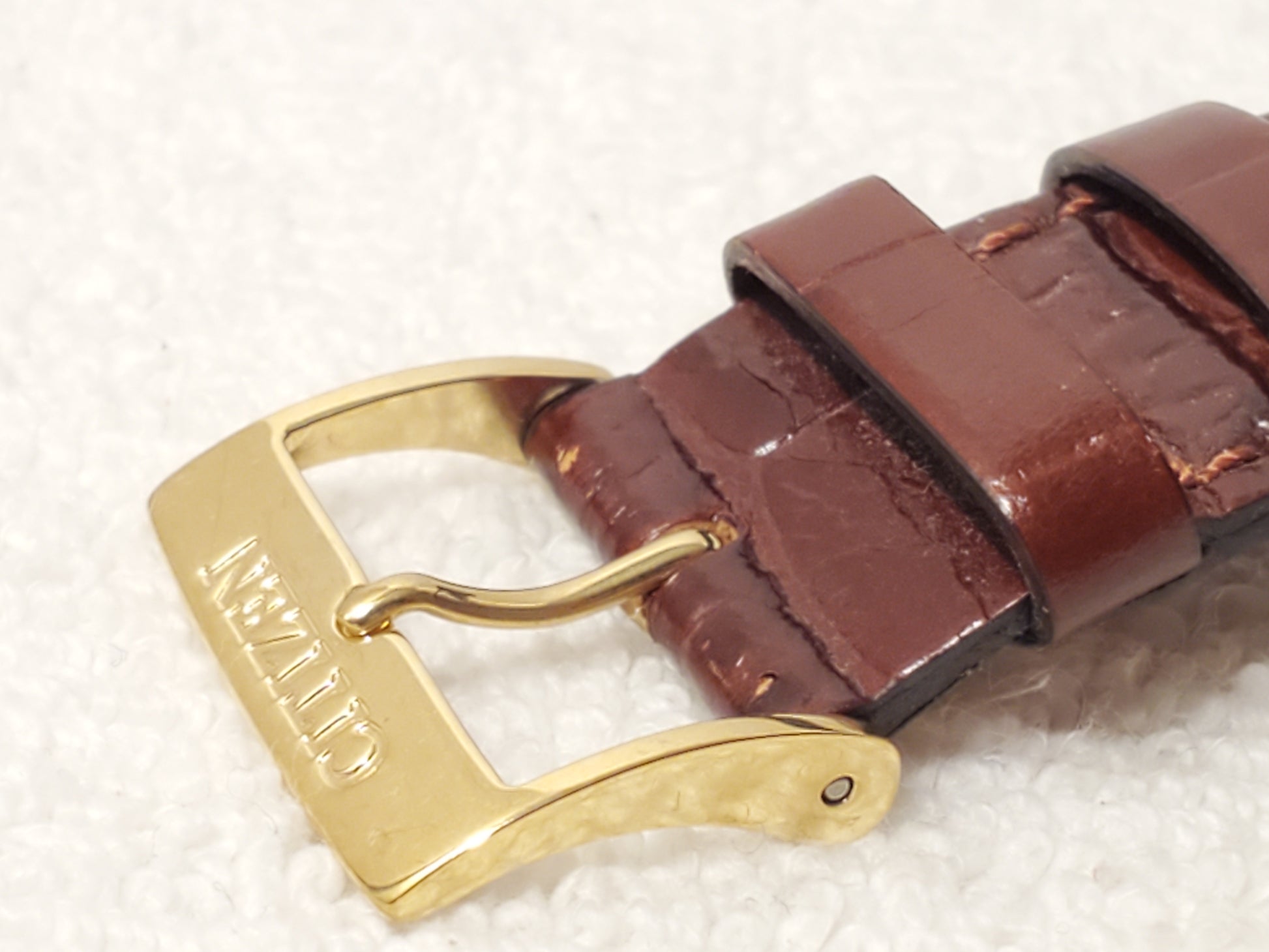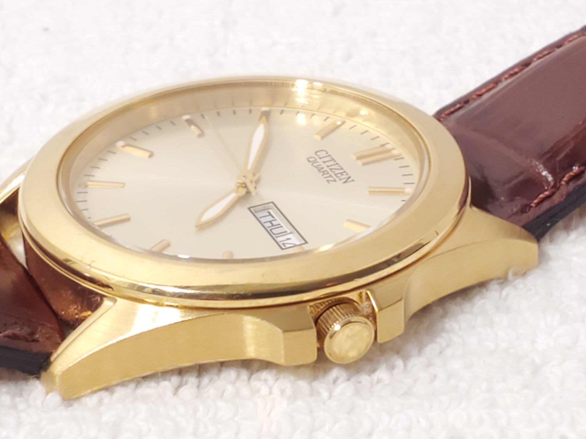 Vintage Citizen Men's Day Date Gold Plated Quartz Watch Brown Leather Strap SS