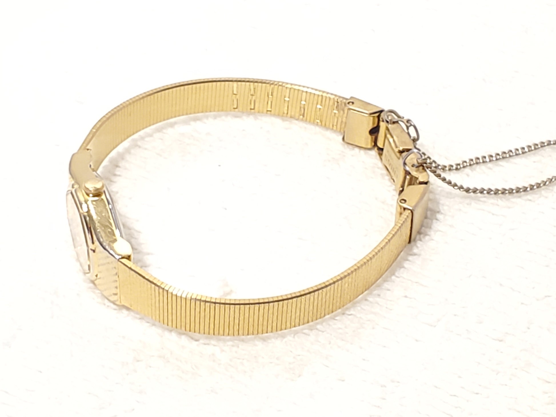 TWO MINOR VERY SMALL GHOST SCRATCHES ON MINERAL CRYSTAL GLASS WINDOW HARD TO SEE. LITE FADING ON BEZEL. ONE OWNER. GENTLY USED. VERY GOOD CONDITION COSMETICALLY. New ENERGIZER battery installed AUGUST 2025, tested, inspected, and witnessed, everything works, fully functional as manufactured, smoke and pet free, CLEAN, DETAILED, POLISHED, BRIGHT, SHINY, ready to wear. Wrist fit comfortable 6 1/4". Max 6 1/2" tight fit can adjust to fit a smaller size. Photos may be brighter than the original color. Case size 17m, thickness 6m, octagonal fixed bezel, brick style dial, mesh band, stainless steel, base metal, one jewel, gold plated movement, vintage 1980's, safety dress chain.