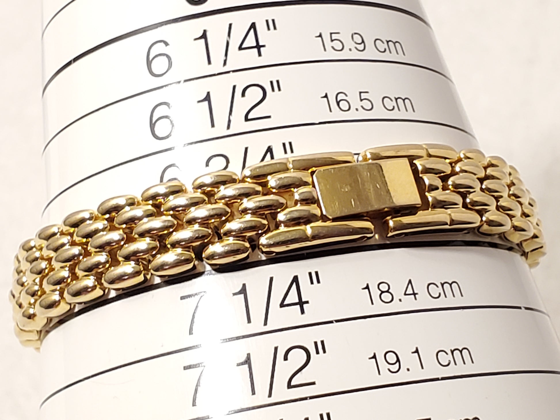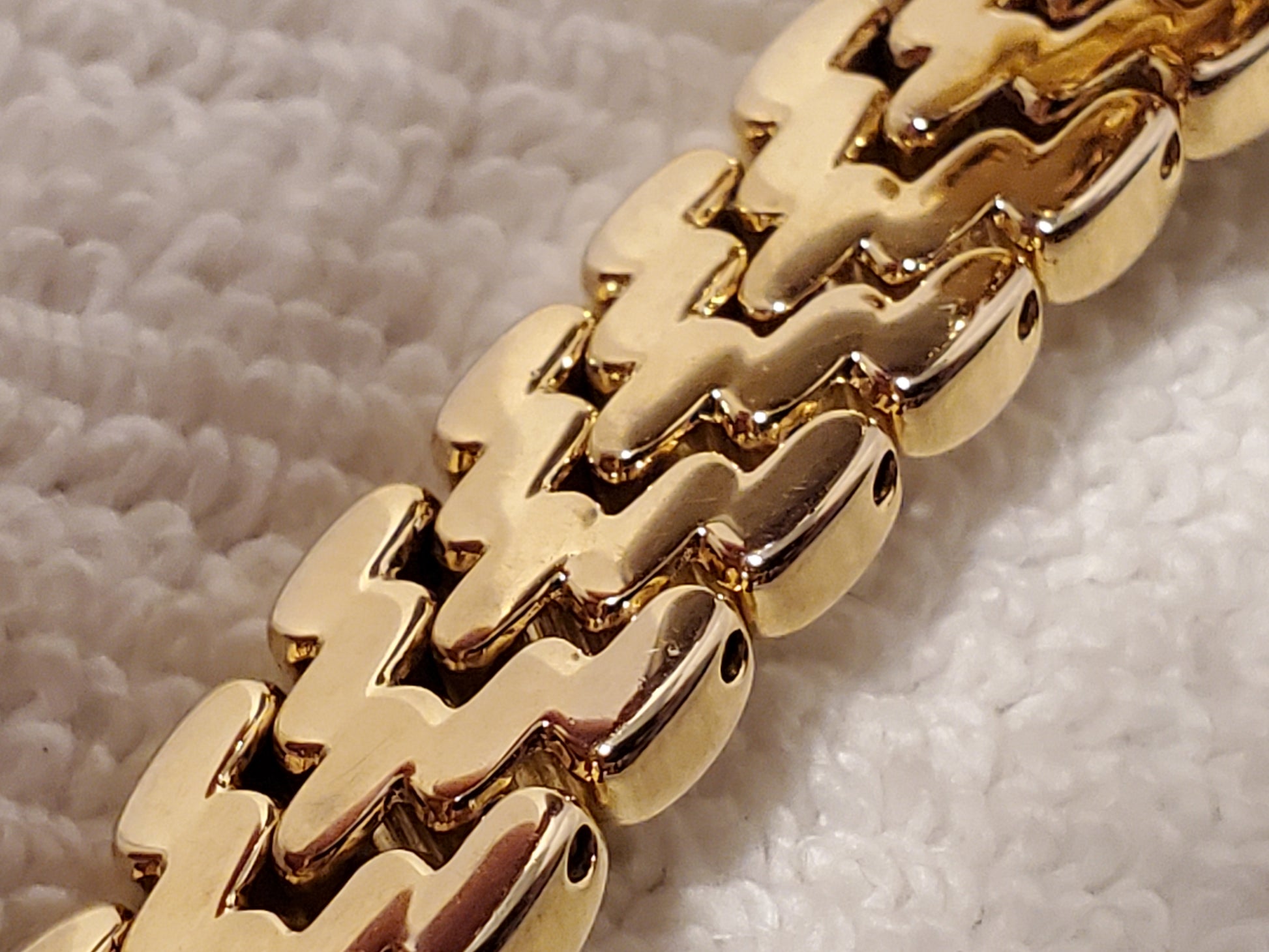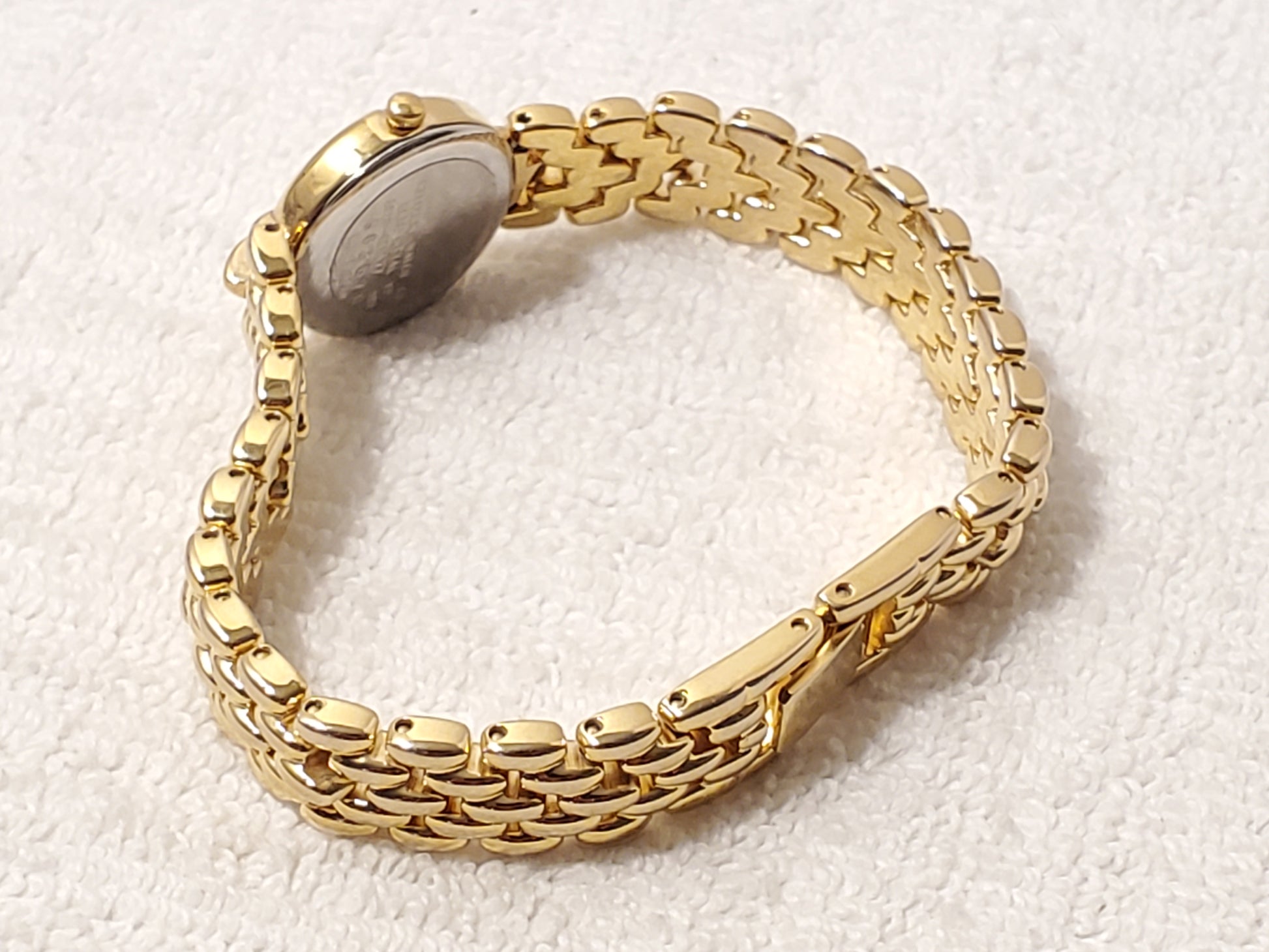 A few minor tiny to small ghost to light scratches on mineral crystal glass window nothing major. ONE OWNER. May see ghost to lite scratches on back plate all minor. Still has plastic protector on back plate. New ENERGIZER battery installed AUGUST 2025, tested, inspected, and witnessed, everything works, fully functional as manufactured, smoke and pet free, CLEAN, DETAILED, POLISHED, BRIGHT, SHINY, ready to wear. Wrist fit comfortable 6 1/2". Max 6 3/4" tight fit can adjust to fit a smaller size. Photos may be brighter than the original color. Case size 19m, thickness 6m, mother of pearl dial, gold tone, vintage 1990's, removable links, stainless steel, gold plated movement, roman numerals.