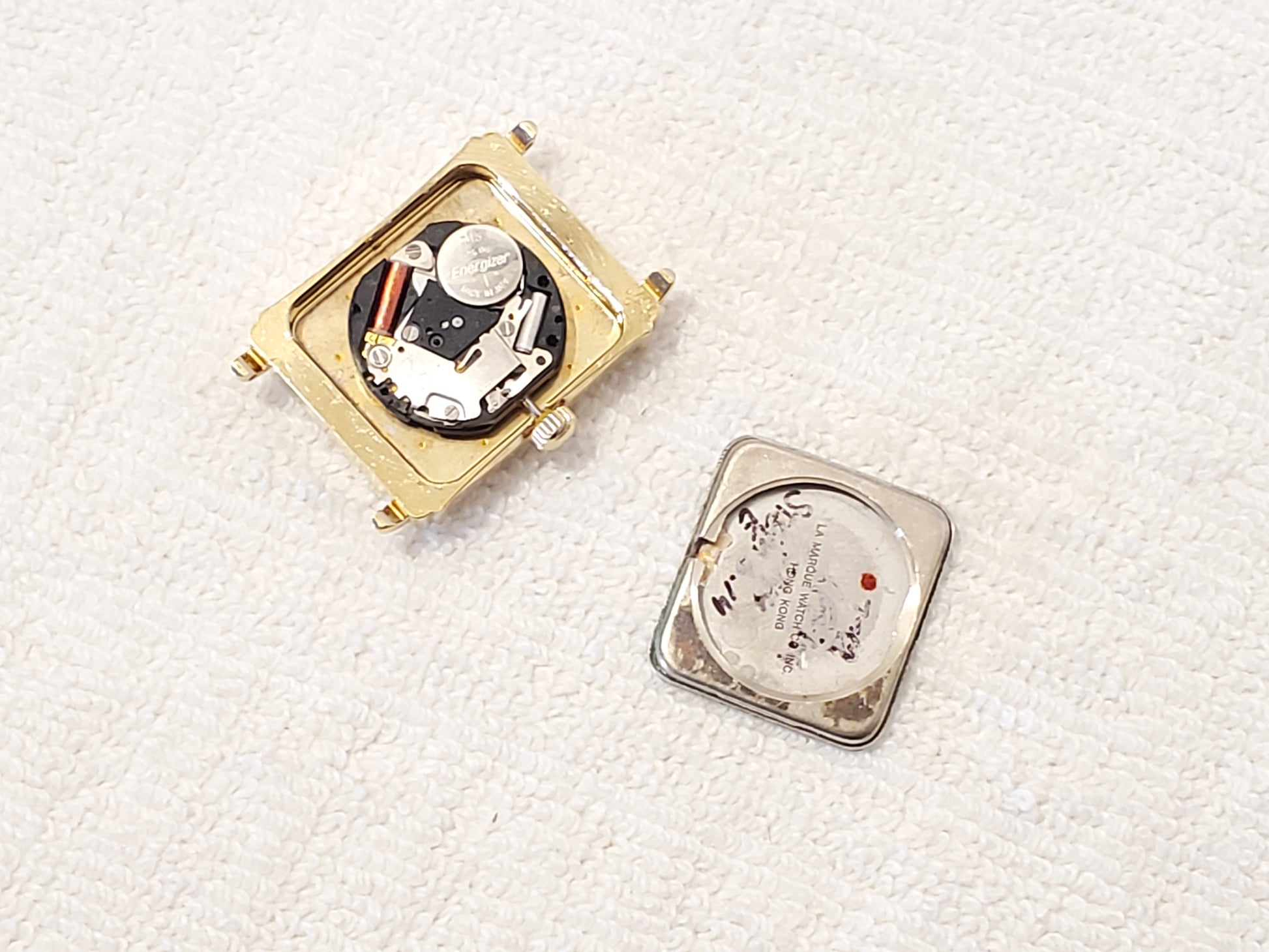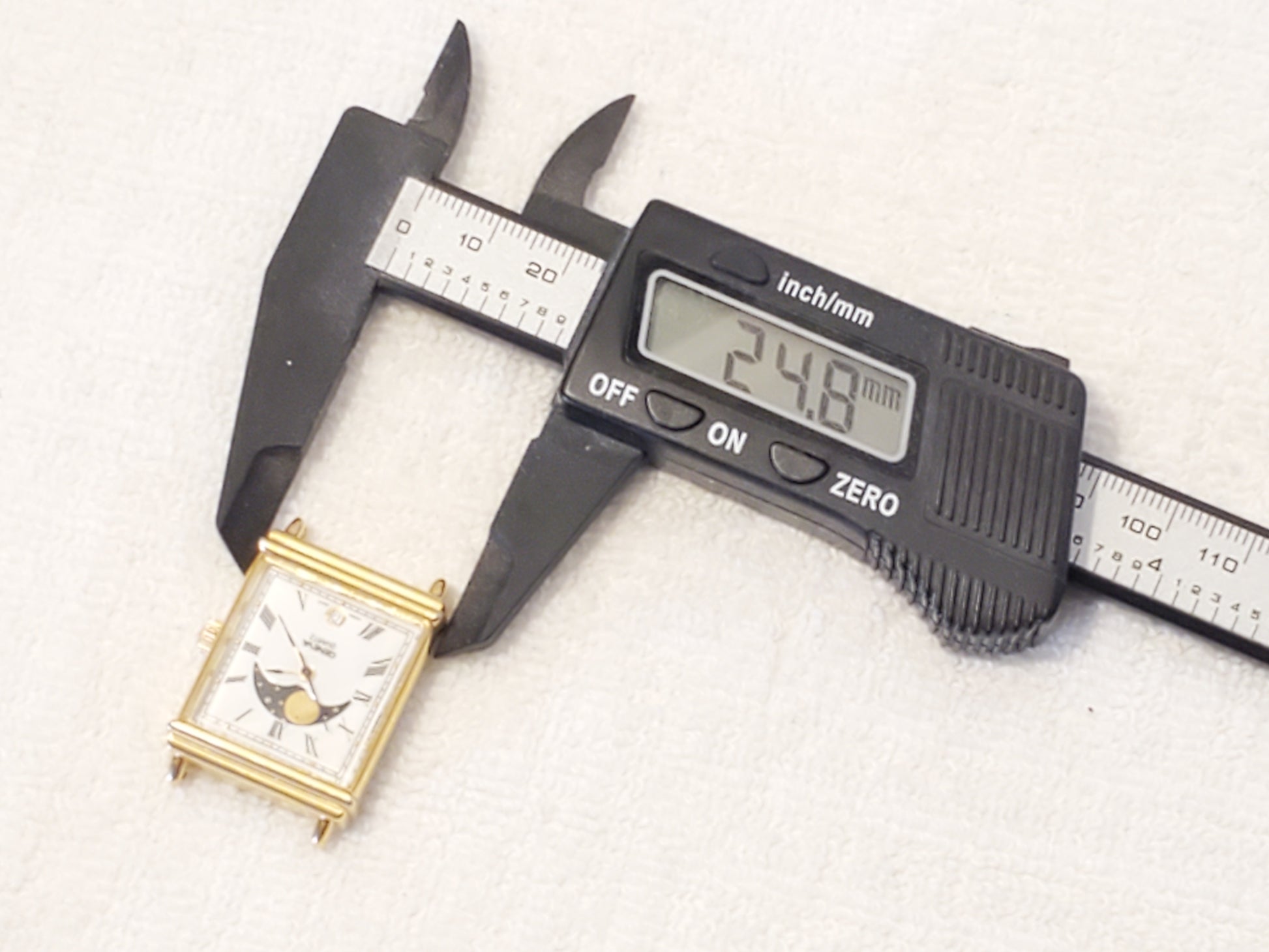 Two minor tiny to small ghost to light scratches on mineral crystal glass window nothing major. ONE OWNER. NO BAND. VERY GOOD CONDITION COSMETICALLY. May see ghost to lite scratches on back plate all minor. New ENERGIZER battery installed JULY 2025, tested, inspected, and witnessed, everything works, fully functional as manufactured, smoke and pet free, CLEAN. Photos may be brighter than the original color. Case size 25m, thickness 8m, ceramic white dial, roman numerals, date indicator, moonphase, gold tone, one jewel, stainless steel, base metal, Japan Movement, vintage 1980's, no fading.