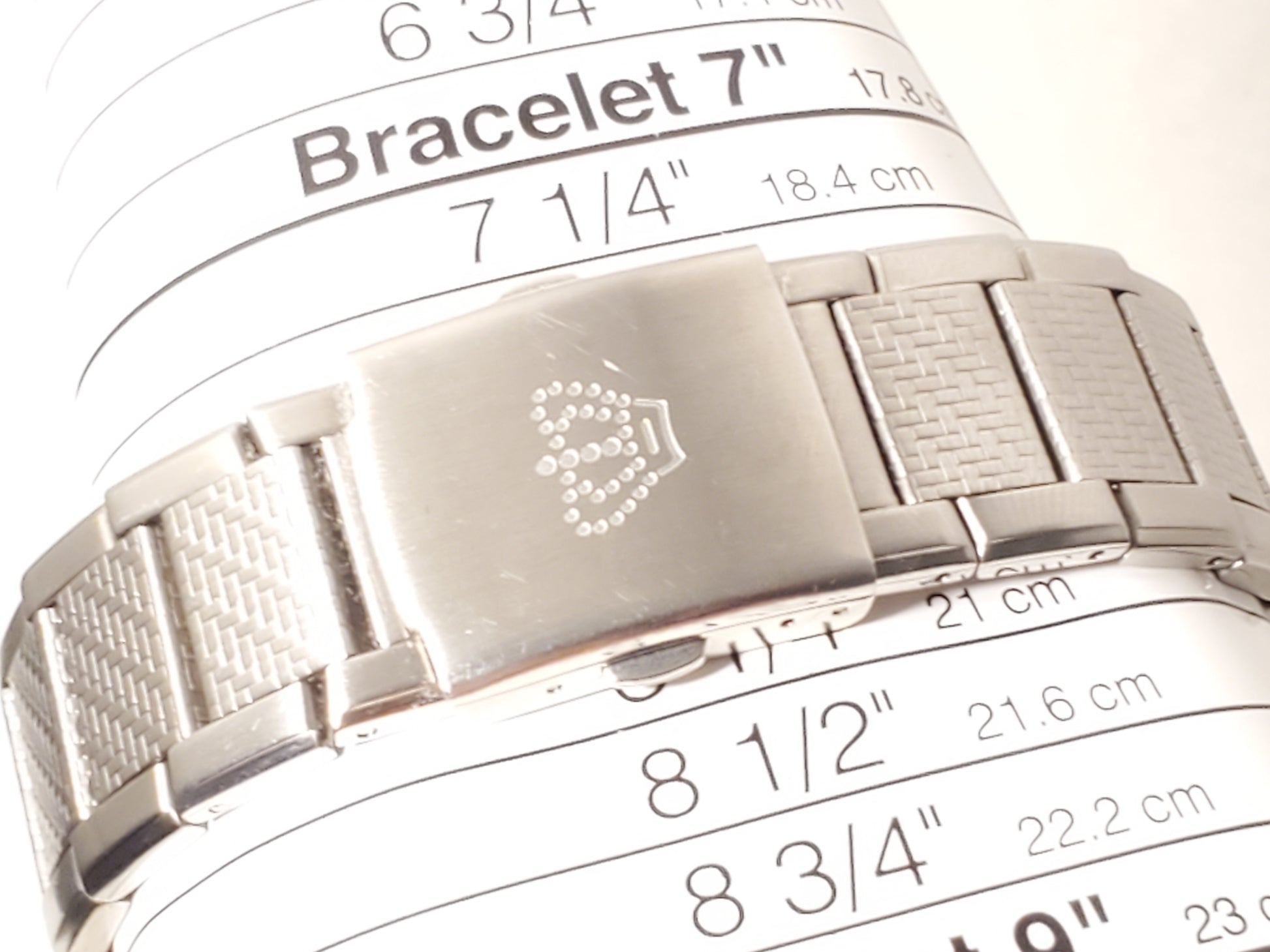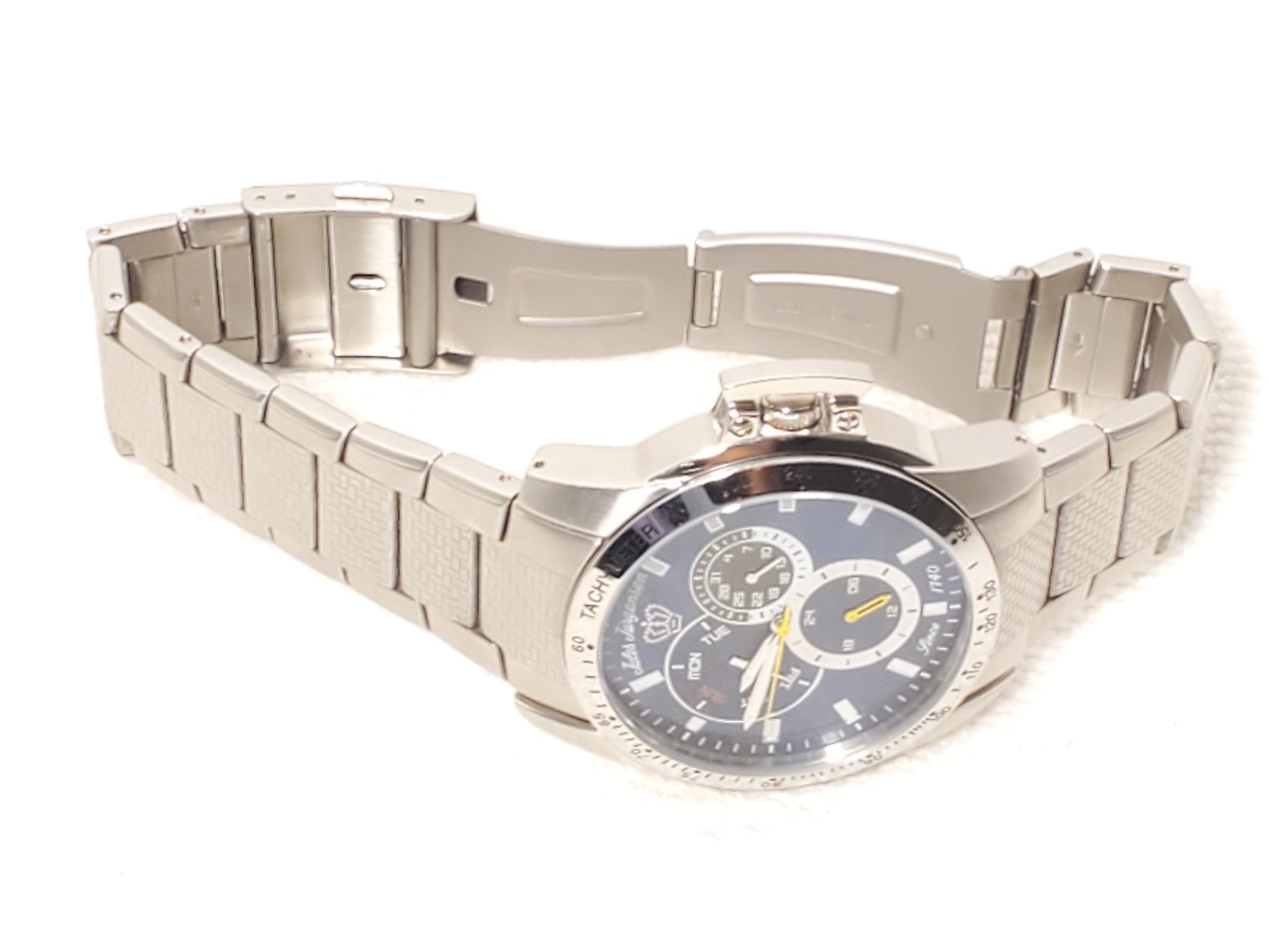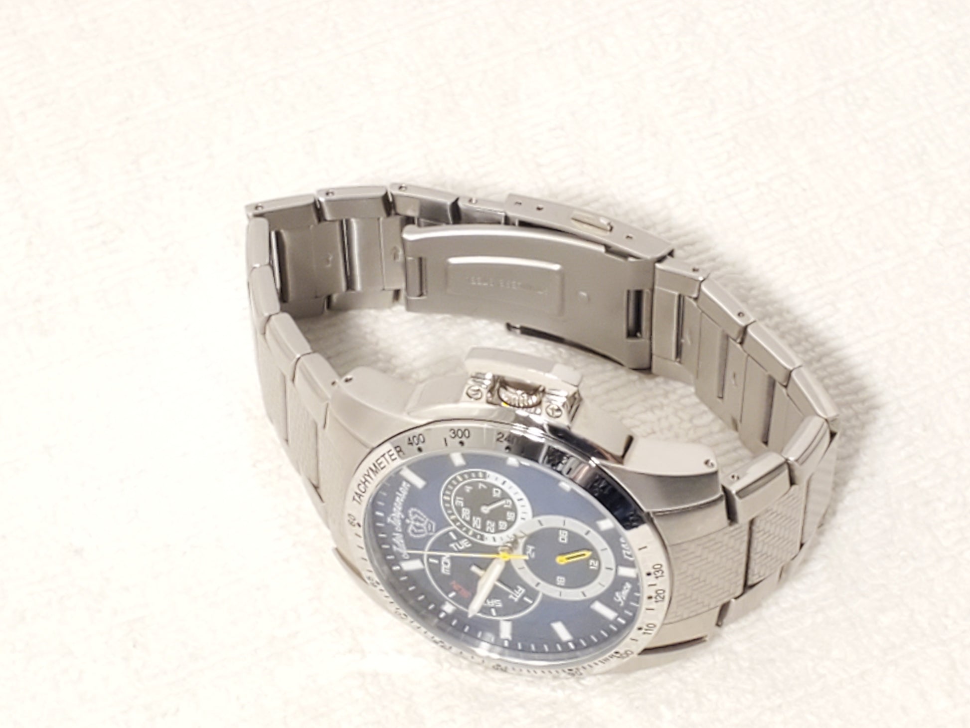 NO SCRATCHES OR SCUFFS ON THICK MINERAL CRYSTAL GLASS WINDOW. ONE OWNER. May see ghost to lite scratches on bracelet, bezel, clasp all minor. Still has plastic protector on back plate. New MAXELL battery installed AUGUST 2025, tested, inspected, and witnessed, everything works, fully functional as manufactured, smoke and pet free, CLEAN, DETAILED, POLISHED, BRIGHT, SHINY, ready to wear. Wrist fit comfortable 7 3/4". Max 8" tight fit can adjust to fit a smaller size. Photos may be brighter than the original color. Case size 48m, thickness 12m, blue dial, multifunction, fixed tachymeter, luminous hands and indexes, yellow minute and 24 hour hand, stainless steel, silver tone, screwback plate, crown guard snap lock, removable links, micro adjustments, vintage, water resistance 100 meters, day date indicator.
