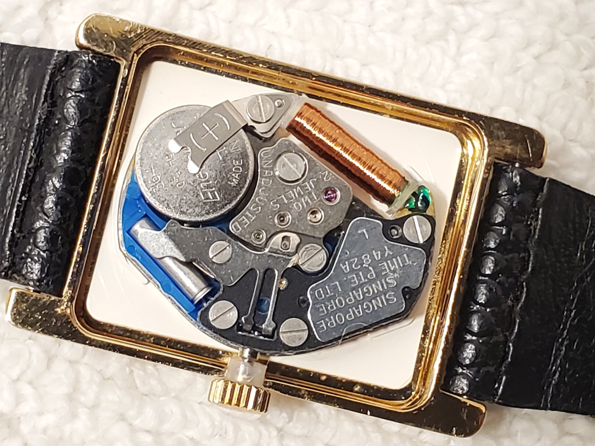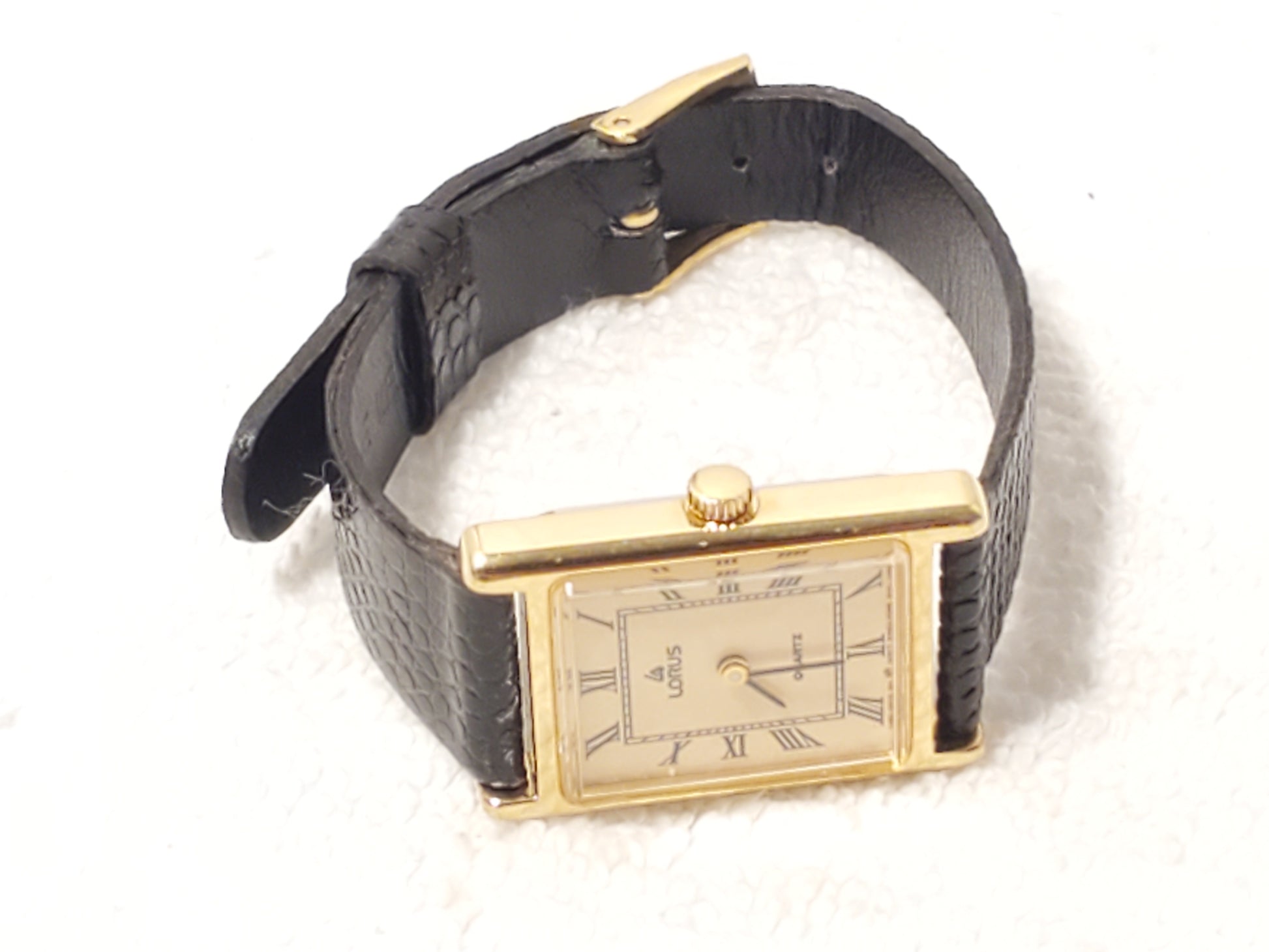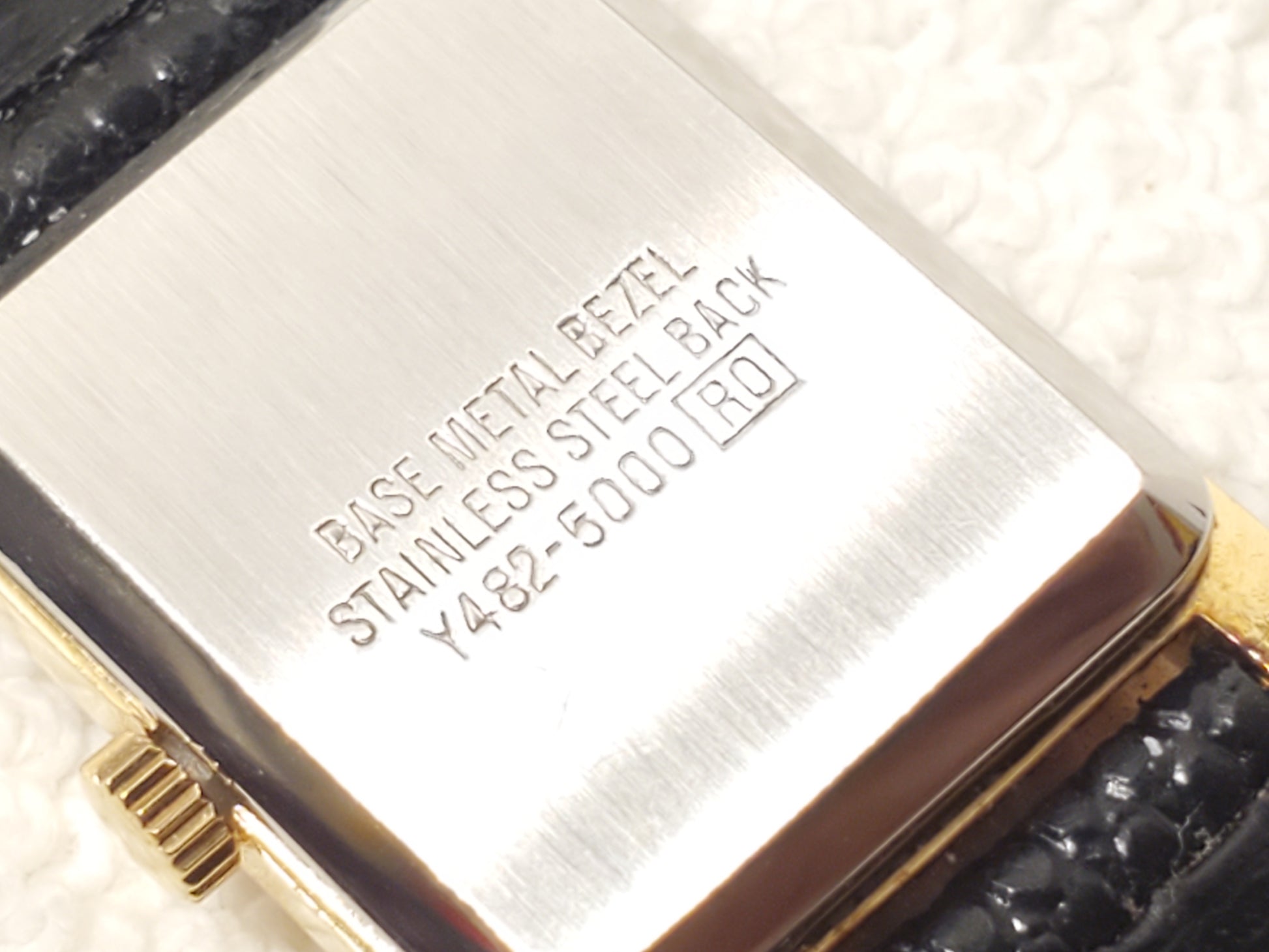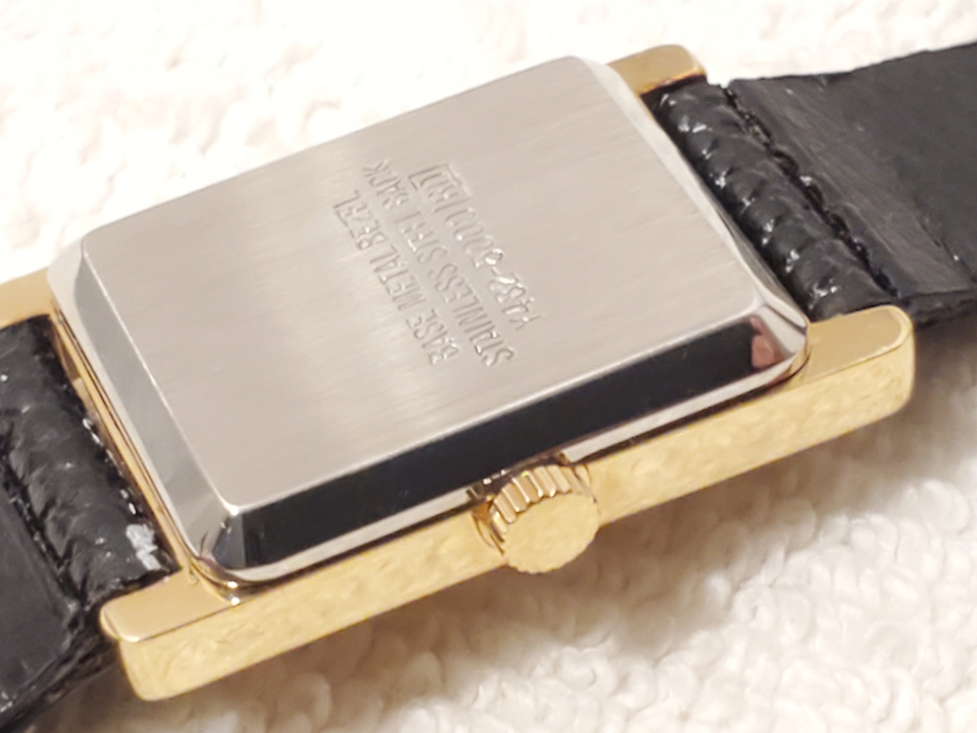 A few minor tiny to small ghost to light scratches on acrylic crystal window nothing major. ONE OWNER. GENTLY USED. VERY GOOD CONDITION COSMETICALLY. May see ghost to lite scratches on back plate all minor. New ENERGIZER battery installed AUGUST 2025, tested, inspected, and witnessed, everything works, fully functional as manufactured, smoke and pet free, CLEAN, DETAILED, POLISHED, BRIGHT, SHINY, ready to wear. Wrist fit up to 6" max tight fit can adjust to fit a smaller size. Photos may be brighter than the original color. Case size 16m, thickness 7m, black roman numerals, gold tone, stainless steel, vintage 1980's, black leather strap, Singapore, gold or off white dial, tank style case, two jewels, no fading.