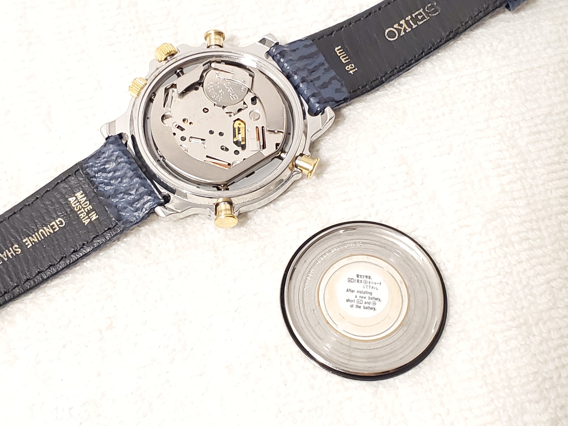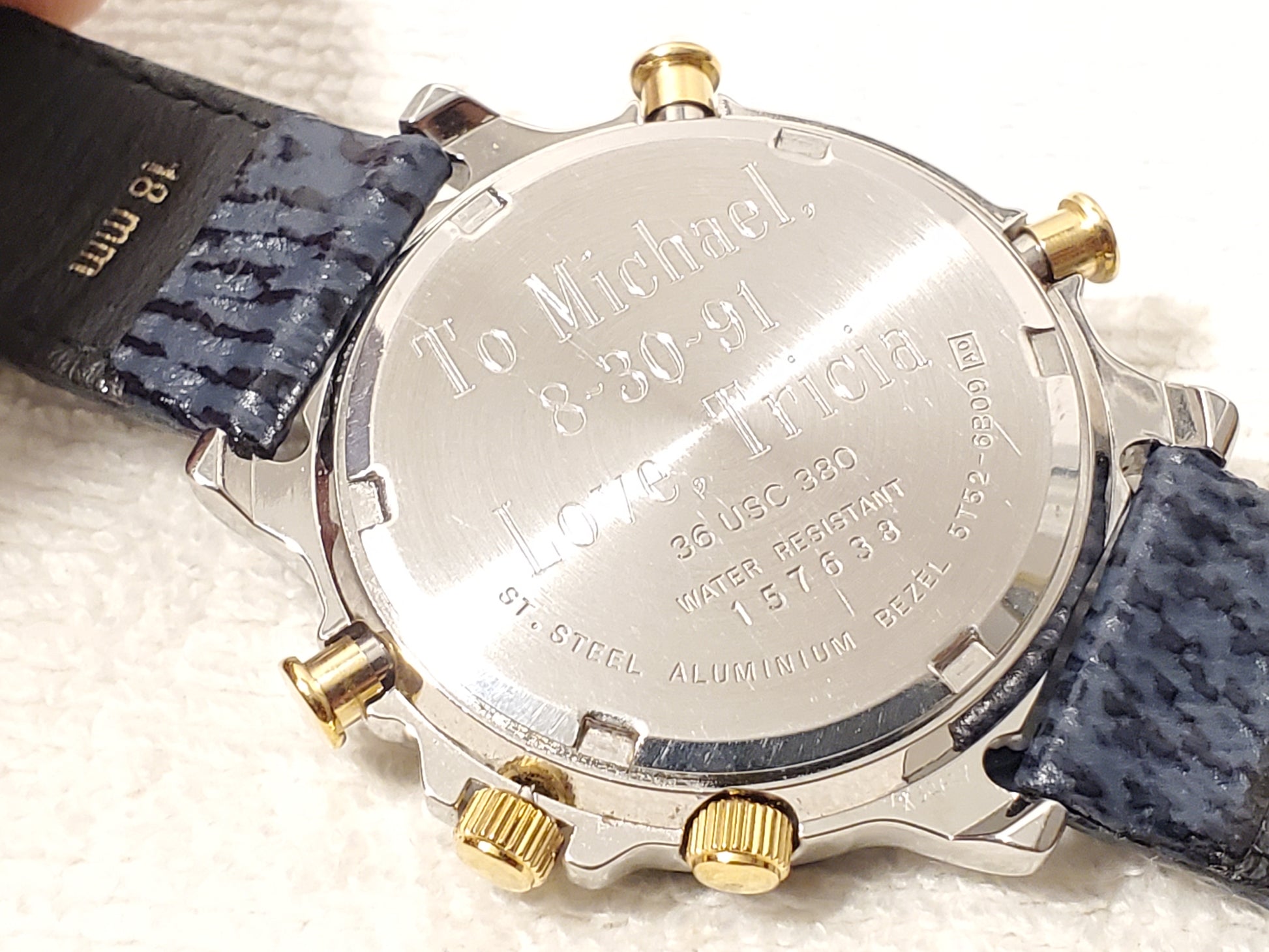 Two minor tiny to small ghost to light scratches on mineral crystal glass window nothing major. May see ghost to lite scratches on back plate all minor. Personal engravement on back plate. Lite to medium damage to case. New ENERGIZER battery installed AUGUST 2025, tested, inspected, and witnessed, everything works, fully functional as manufactured, smoke and pet free, CLEAN, DETAILED, POLISHED, BRIGHT, SHINY, ready to wear. Wrist fit up to 7 1/2" max tight fit can adjust to fit a smaller size. Photos may be brighter than the original color. Case size 37m, thickness 10m, blue silver dial, world time, alarm, date indicator, blue bezel, stainless steel, water resistance 30 meters, blue black leather thick leather strap, gold tone trim, screwback plate, vintage 1990's, crown guard, splash proof.