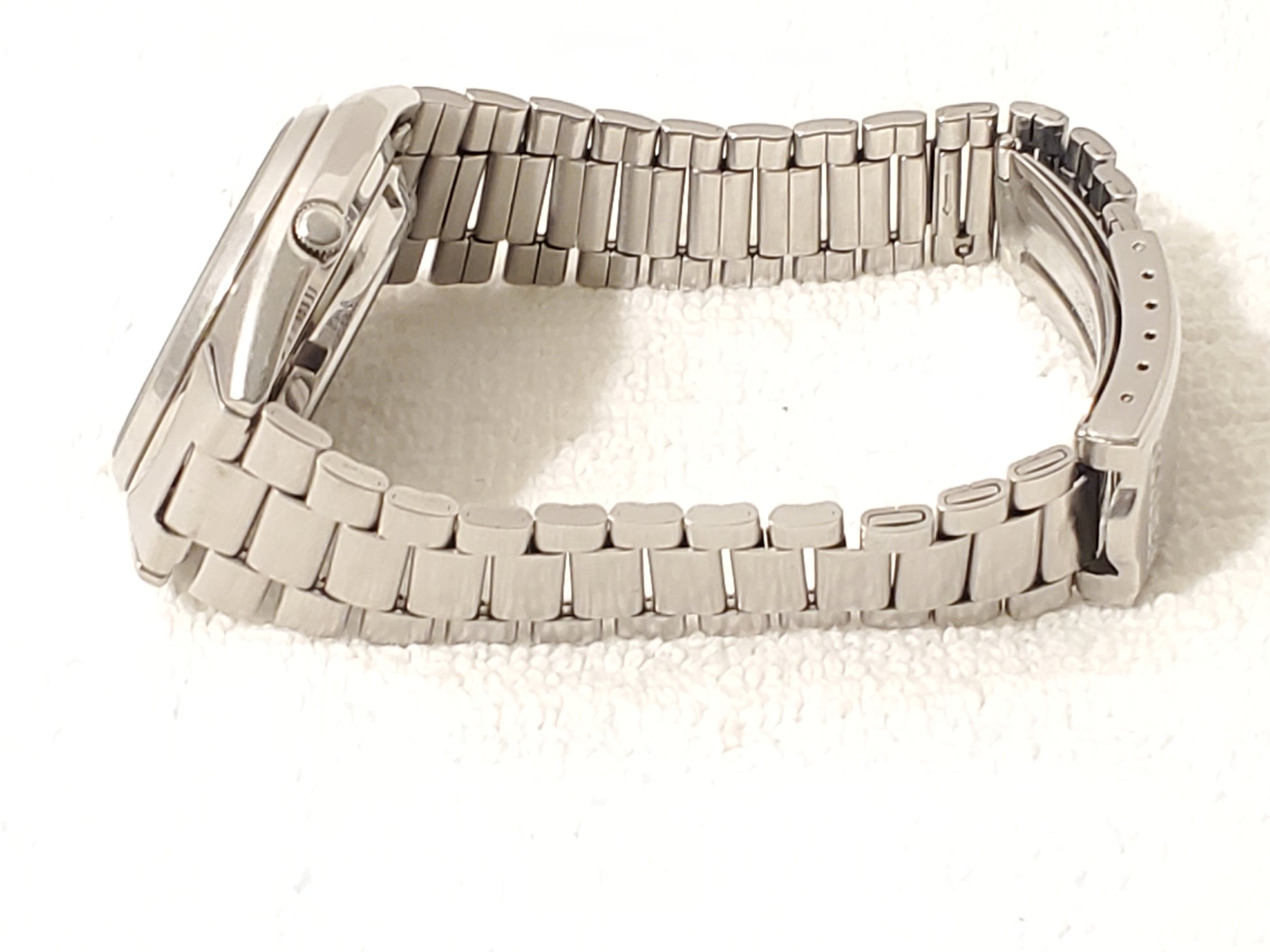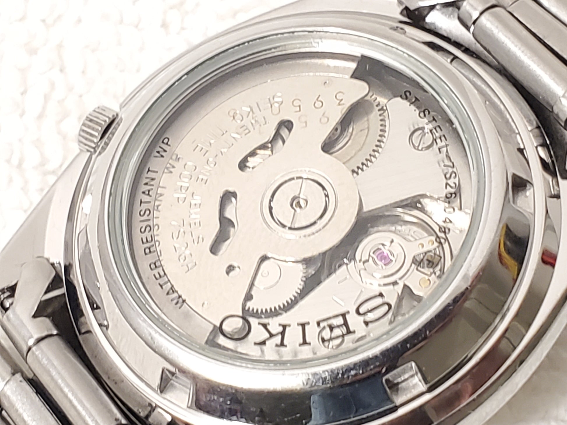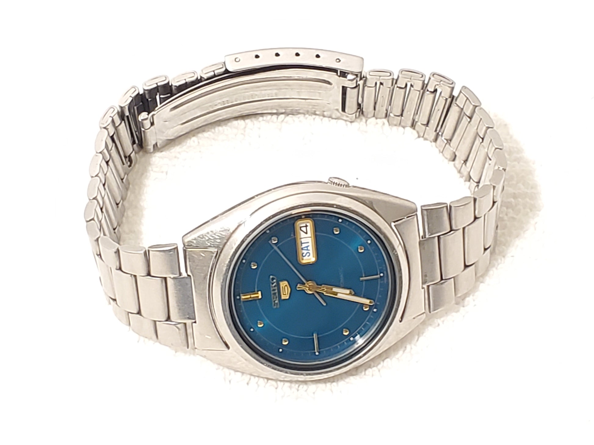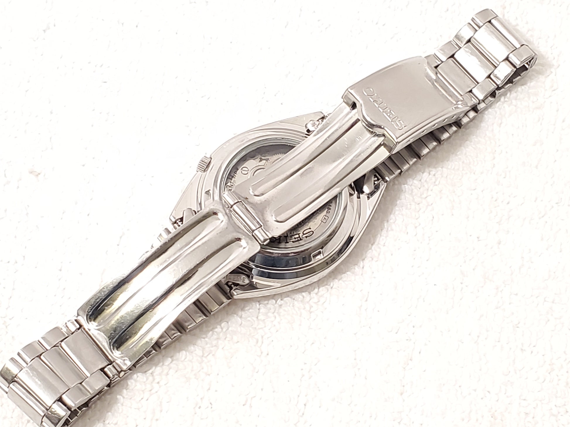 NO SCRATCHES OR SCUFFS ON THICK MINERAL CRYSTAL GLASS WINDOW. May see ghost to lite scratches on back glass plate, bracelet, clasp, bezel, case all minor. SEPTEMBER 2025, tested, inspected, and witnessed, everything works, fully functional as manufactured, smoke and pet free, CLEAN, DETAILED, POLISHED, BRIGHT, SHINY, ready to wear. Wrist fit comfortable 8". Max 8 1/4" tight fit can adjust to fit a smaller size. Photos may be brighter than the original color. Case size 37m, thickness 11m, green dial with gold tone markers, day date indicator, luminous hands, screwback plate, 21 jewels, stainless steel, vintage 1990's, removable links, micro adjustments, fold over secure snap clasp, crown guard, automatic, Seiko 5, water resistance 30 meters, splash proof.