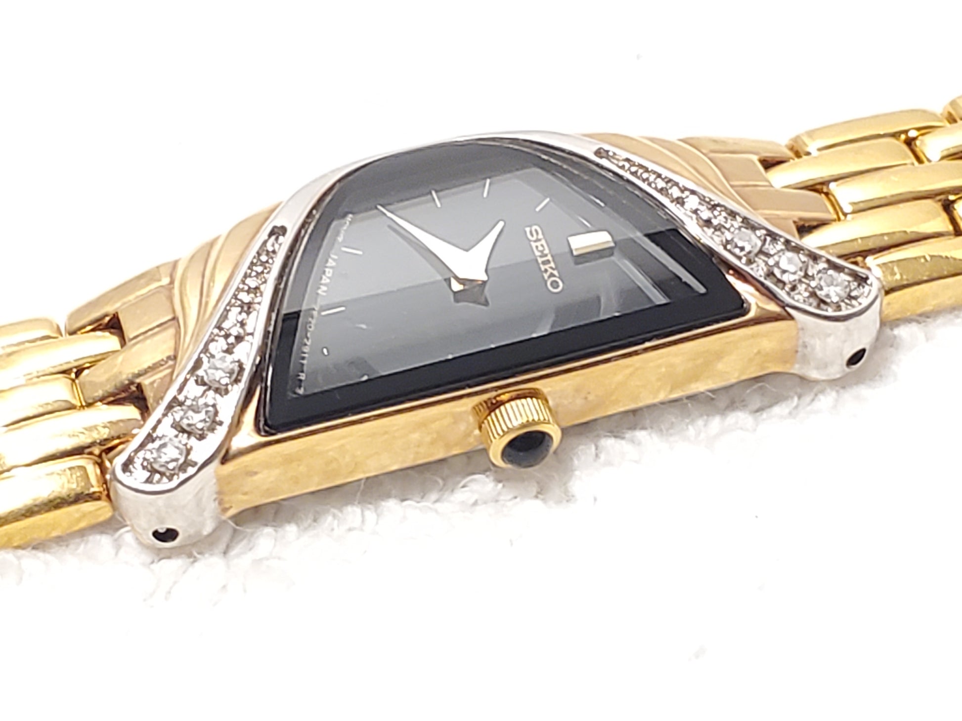 Vintage Seiko Half Moon Women Watch Black Dial Gold Silver Tone 6 Diamonds Bezel