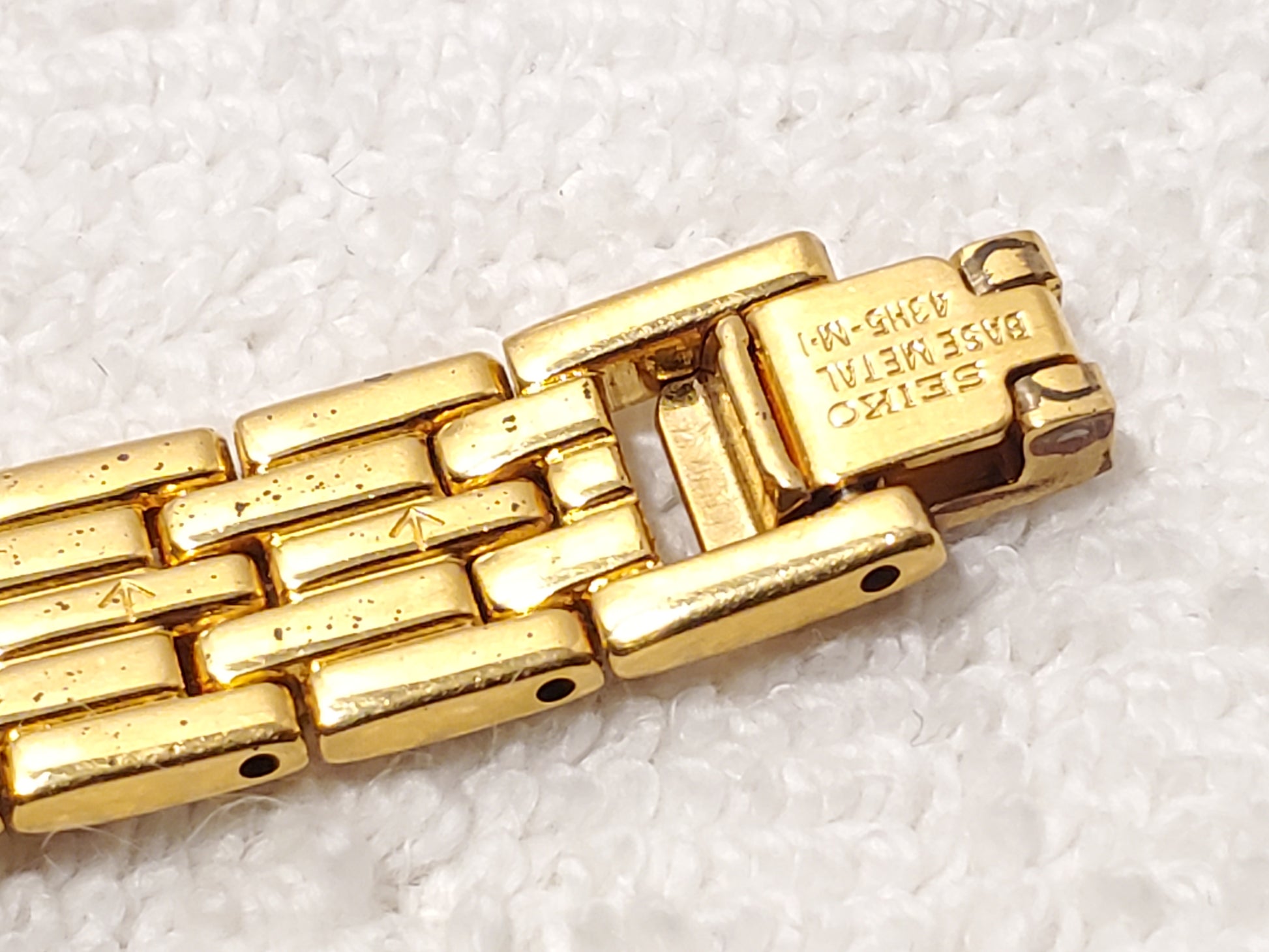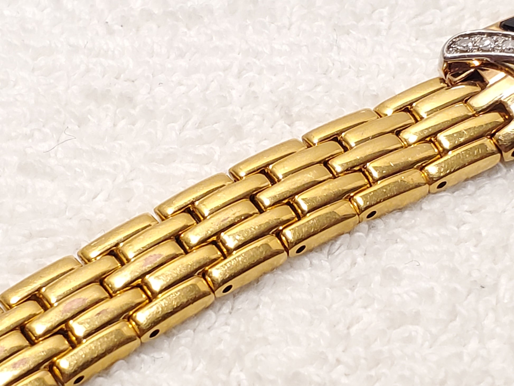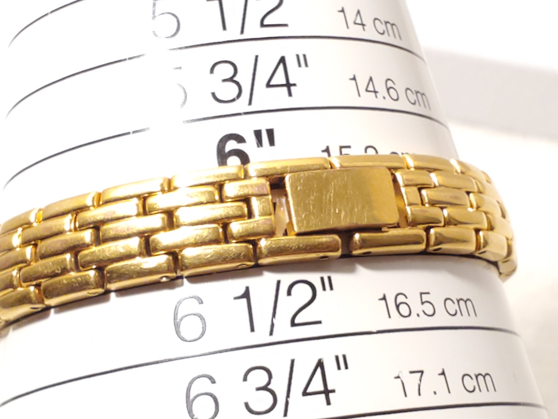 NO SCRATCHES OR SCUFFS ON THICK MINERAL CRYSTAL GLASS WINDOW. NO DIAMONDS ARE MISSING ON BEZEL. ONE OWNER. GENTLY USED. VERY GOOD CONDITION COSMETICALLY. New ENERGIZER battery installed JULY 2025, tested, inspected, and witnessed, everything works, fully functional as manufactured, smoke and pet free, CLEAN, DETAILED, POLISHED, BRIGHT, SHINY, ready to wear. Wrist fit comfortable 5 3/4". Max 6" tight fit can adjust to fit a smaller size. Photos may be brighter than the original color. Case size 13m, thickness 6m, black dial, gold silver tone, black onyx tip crown, six diamonds bezel, stainless steel, base metal, Japan Movement, removable links, jewelry clasp, vintage 1990's, half moon, asymmetrical.