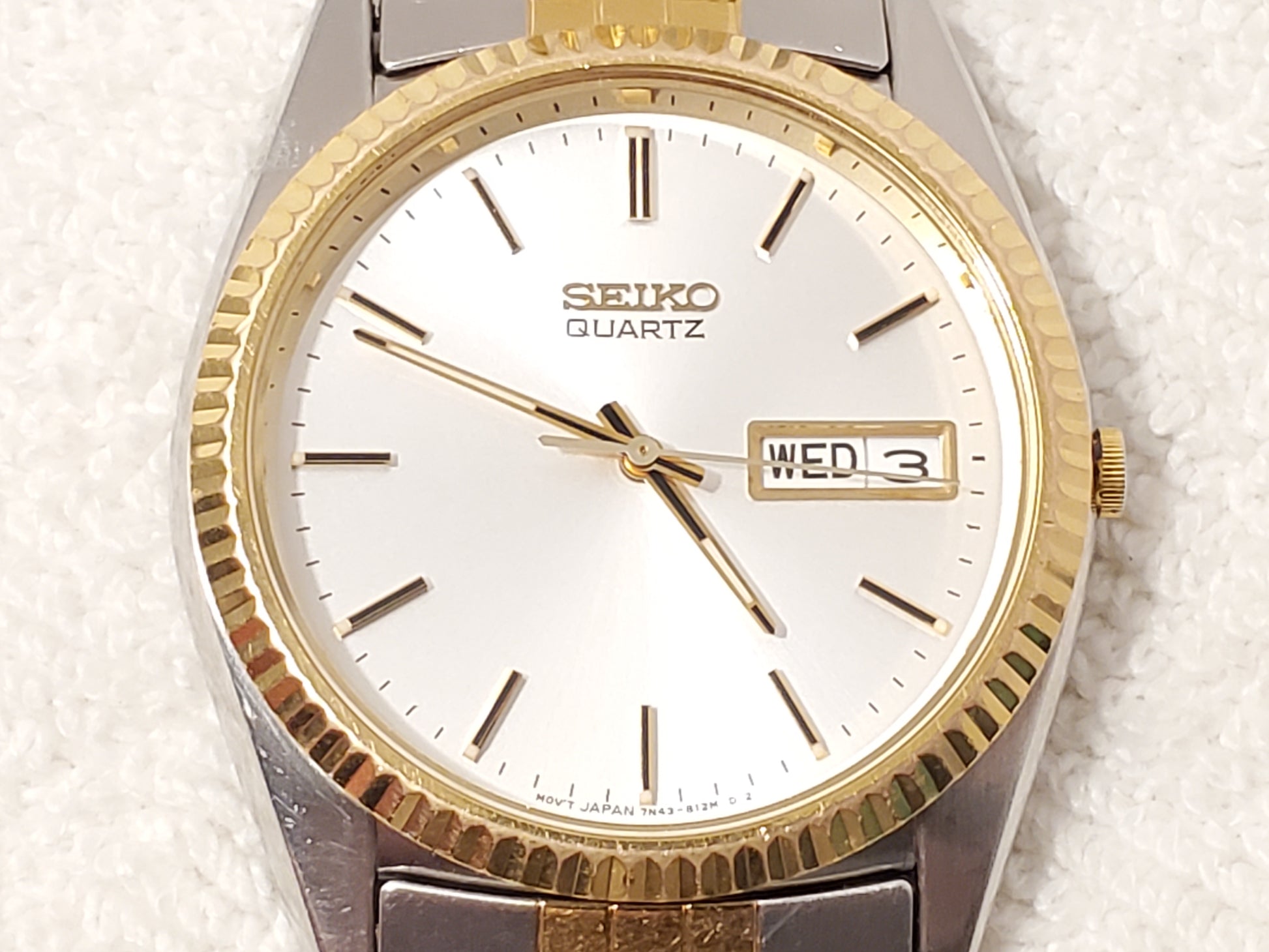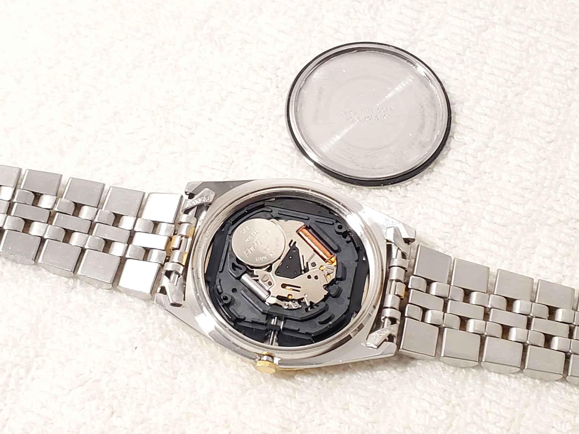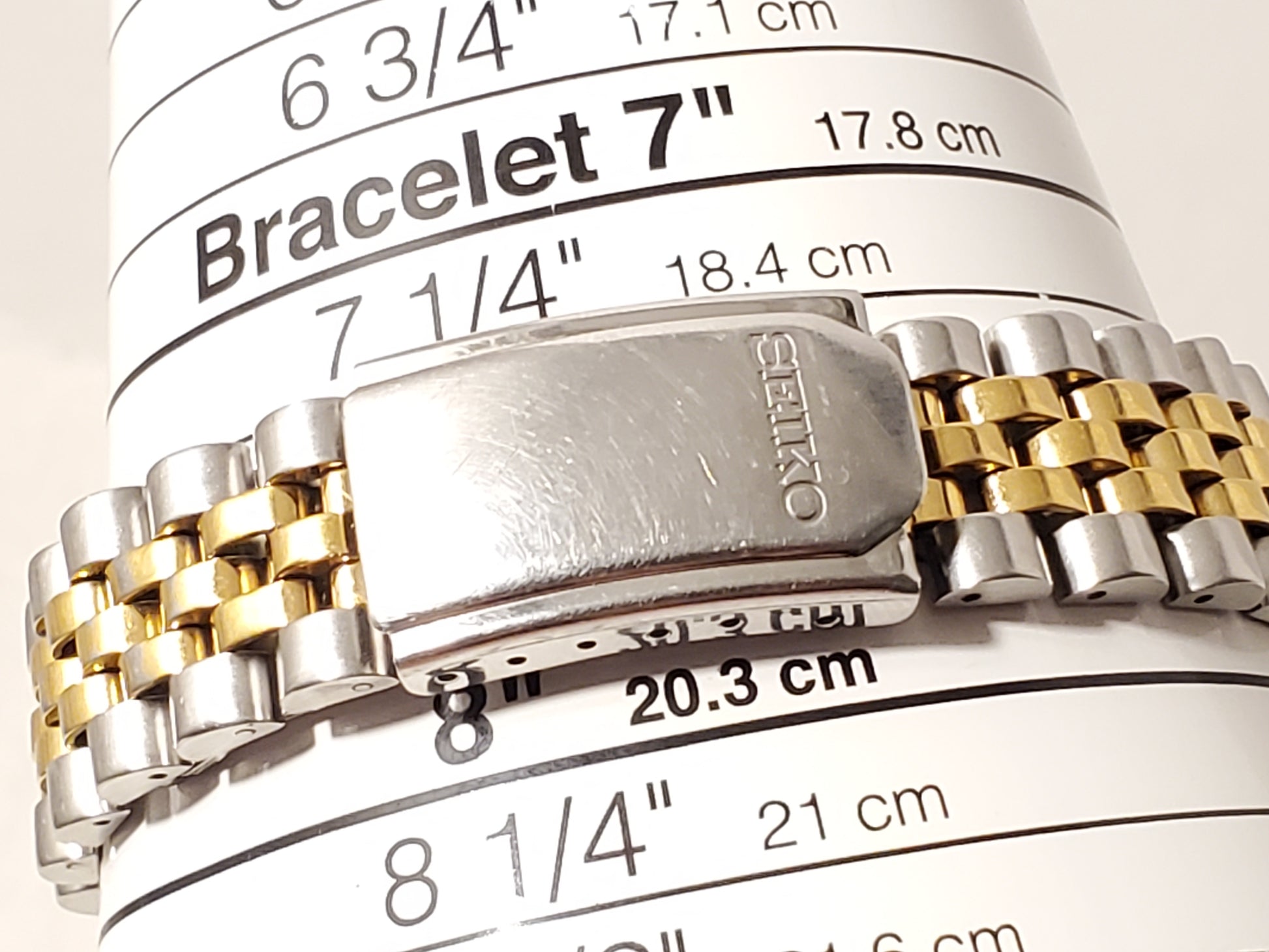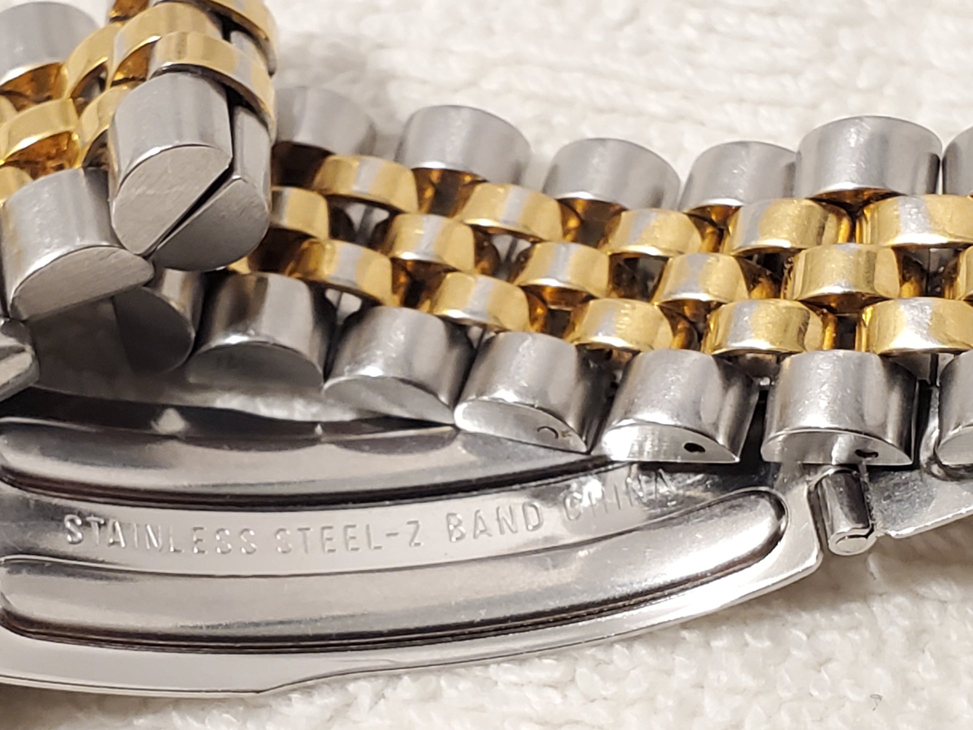 NO SCRATCHES OR SCUFFS ON MINERAL CRYSTAL GLASS WINDOW. ONE OWNER. May see ghost to lite scratches on back plate and clasp all minor. Minor lite fading on bracelet. Personal engravement on back plate. New ENERGIZER battery installed AUGUST 2025, tested, inspected, and witnessed, everything works, fully functional as manufactured, smoke and pet free, CLEAN, DETAILED, POLISHED, BRIGHT, SHINY, ready to wear. Wrist fit comfortable 7 1/4". Max 7 1/2" tight fit can adjust to fit a smaller size. Photos may be brighter than the original color. Case size 36m, thickness 7m, silver dial, day date indicator, luminous hands and indexes, fixed fluted presidential bezel, screwback plate, one jewel, jubilee bracelet, removable links, micro adjustments, fold over secure snap clasp, gold tone, stainless steel, vintage 1990's, water resistance 30 meters.