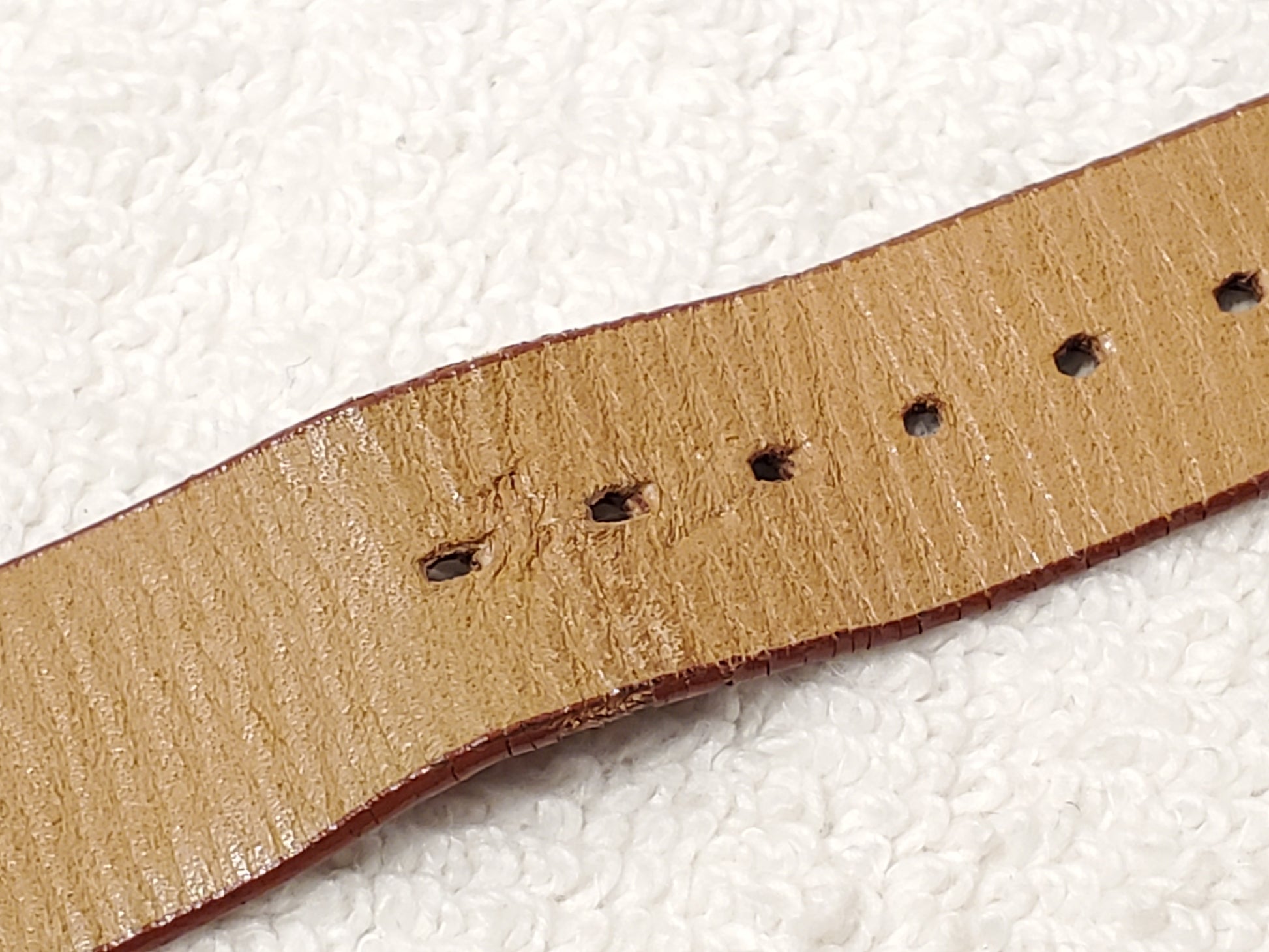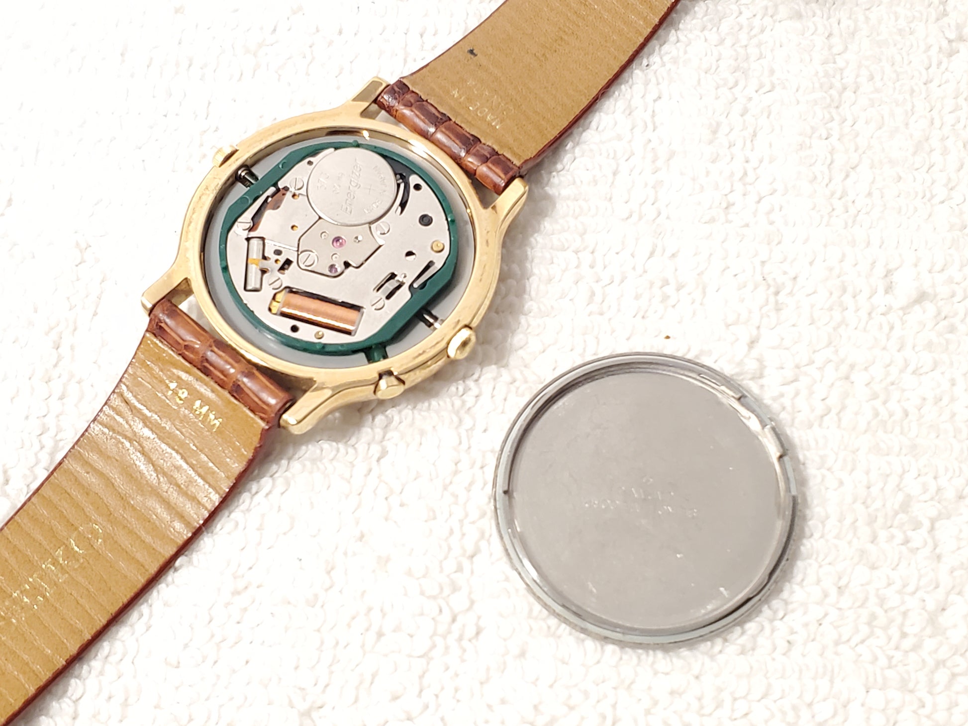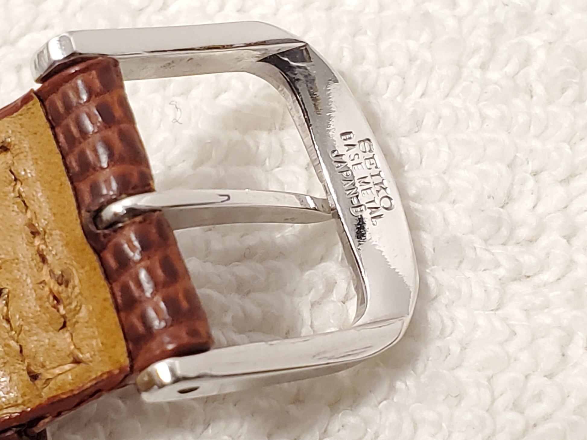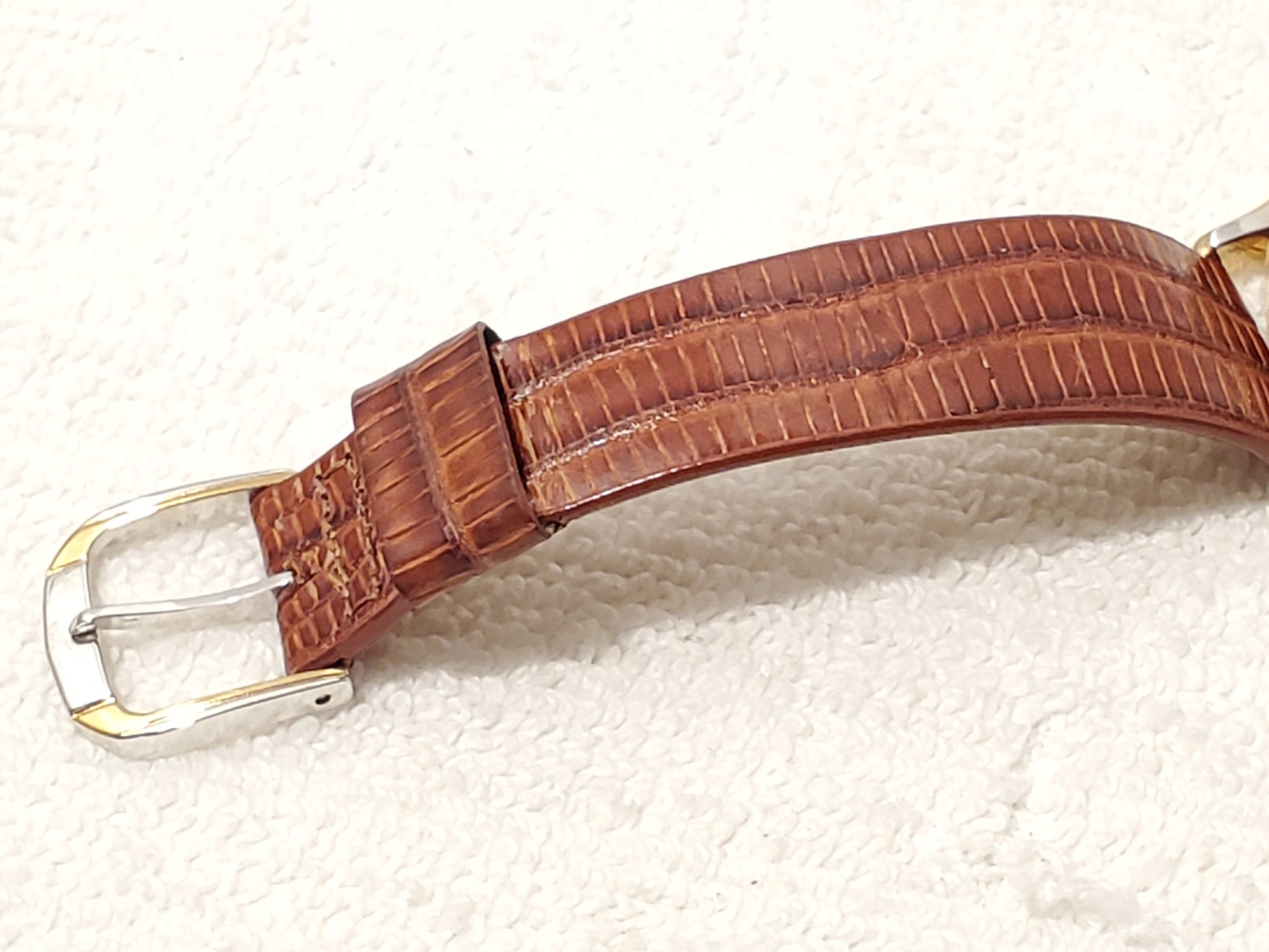 NO SCRATCHES OR SCUFFS ON MINERAL CRYSTAL GLASS WINDOW. ONE OWNER. GENTLY USED. LITE WEAR. VERY GOOD CONDITION COSMETICALLY. May see ghost to lite scratches on back plate all minor. Interior of thin leather strap has lite wear by round adjustments. New ENERGIZER battery installed JULY 2025, tested, inspected, and witnessed, everything works, fully functional as manufactured, smoke and pet free, CLEAN, DETAILED, POLISHED, BRIGHT, SHINY, ready to wear. Wrist fit up to 7 1/2" max tight fit can adjust to fit a smaller size. Photos may be brighter than the original color. Case size 34m, thickness 7m, day date moonphase indicator, white dial, stainless steel, base metal, brown thin leather strap, gold tone, three jewels, Japan Movement, vintage 1980's, 12/24 time telling.