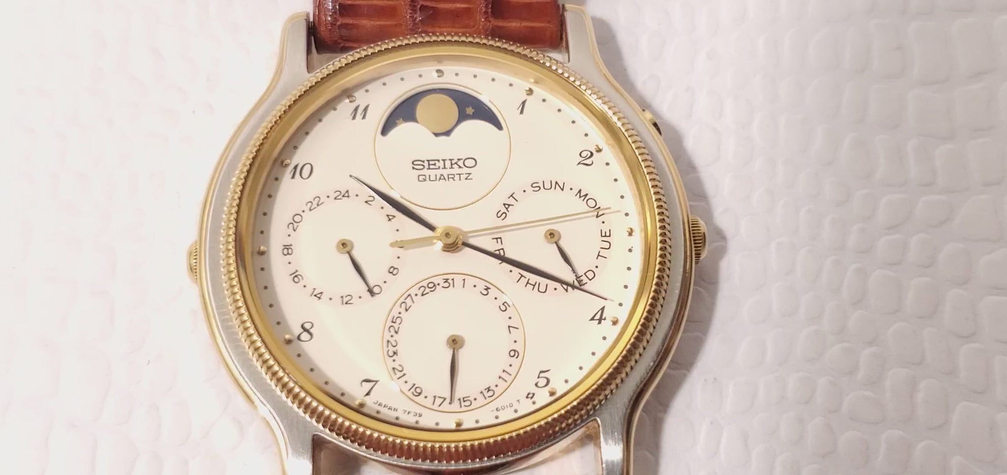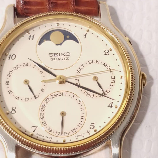 Vintage Seiko Men's Moon Phase Day Date Watch Gold Tone White Dial Three Jewels