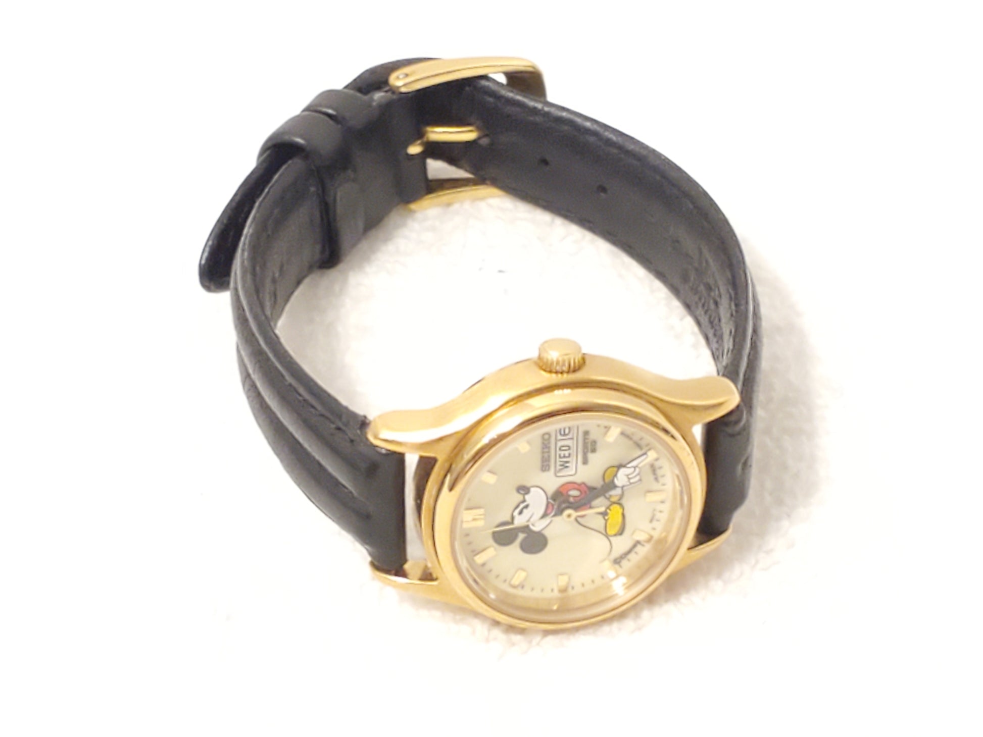 Vintage Seiko Mickey Mouse Women's Day Date Watch Gold Plated Black Leather Band