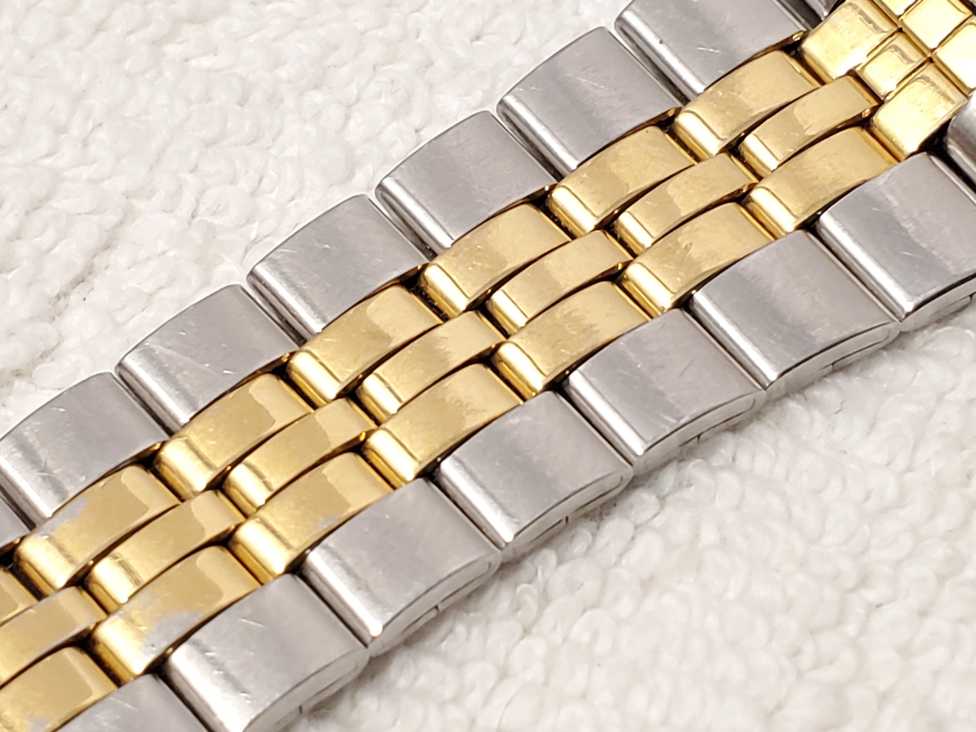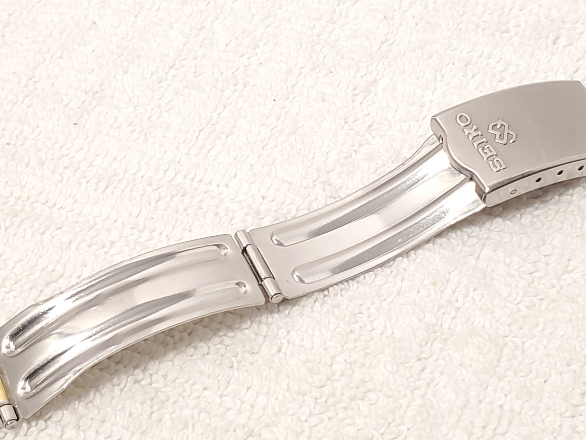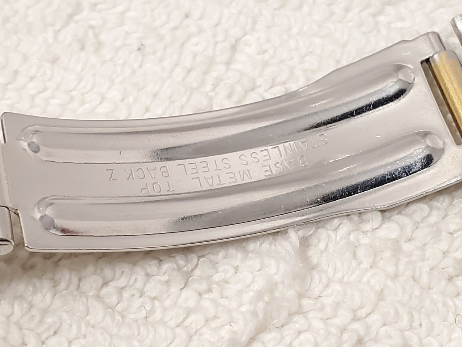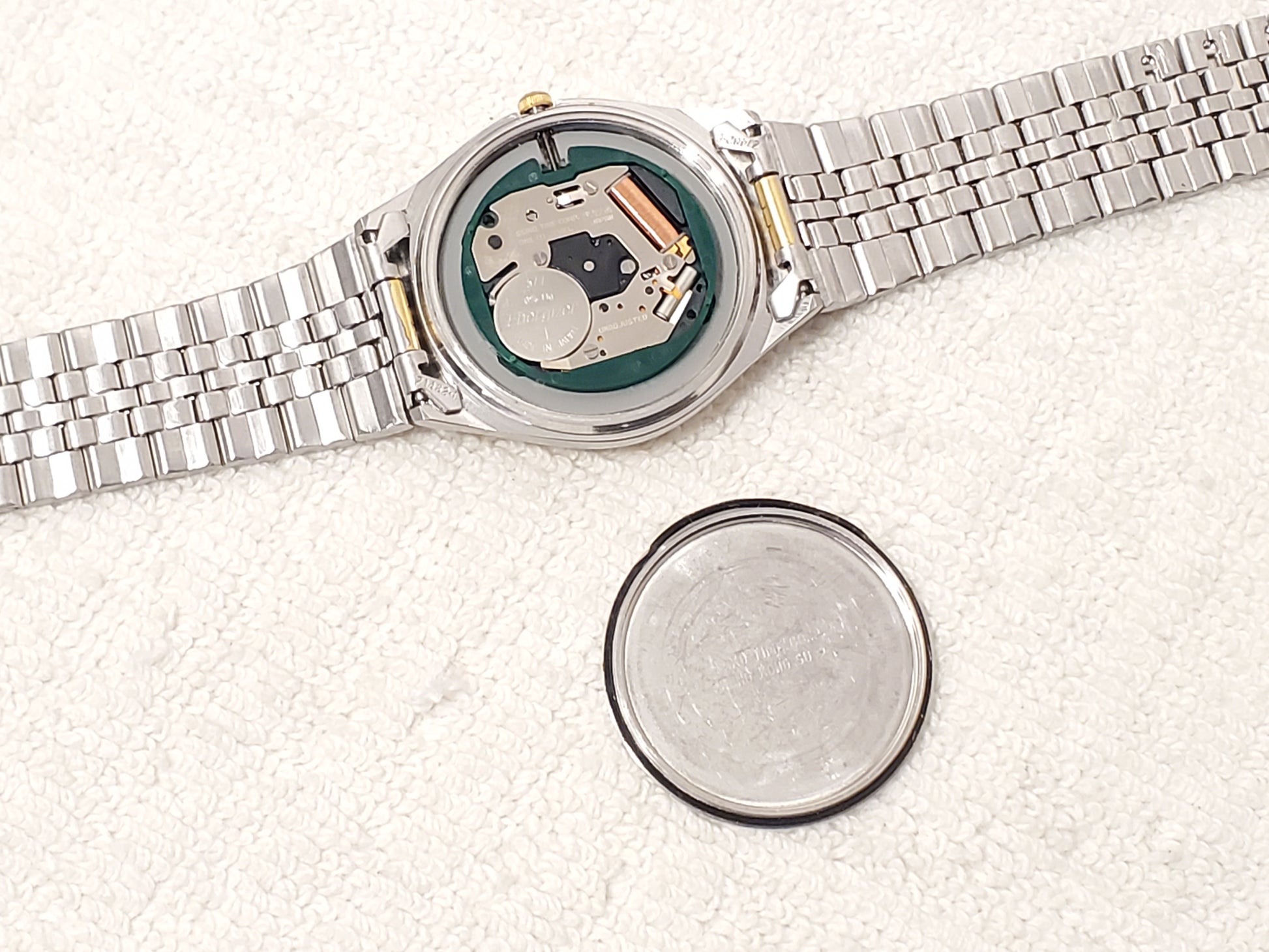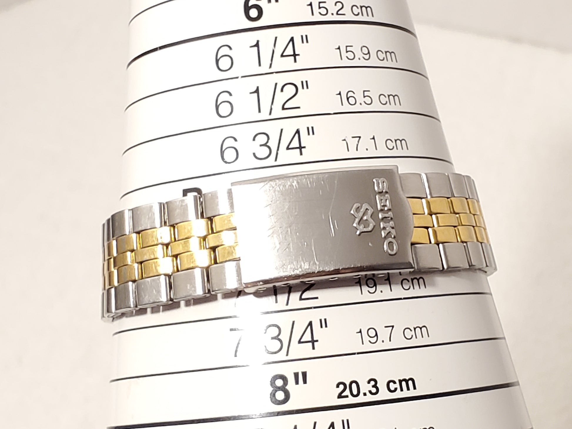 NO SCRATCHES OR SCUFFS ON ACRYLIC CRYSTAL WINDOW. ONE OWNER. May see ghost to lite scratches on back plate, bracelet, clasp, bezel all minor/normal wear for age. Lite wear on crown head. Very minimum fading on one side of bracelet barely can see. New ENERGIZER battery installed JULY 2025, tested, inspected, and witnessed, everything works, fully functional as manufactured, smoke and pet free, CLEAN, DETAILED, POLISHED, BRIGHT, SHINY, ready to wear. Wrist fit comfortable 7". Max 7 1/4" tight fit can adjust to fit a smaller size. Photos may be brighter than the original color. Case size 35m, thickness 7m, gray dial, day date indicator, luminous hands, water resistance 10 meters, screwback plate, removable links, micro adjustments, fold over secure snap clasp, stainless steel, gold tone, vintage 1980's, one jewel.