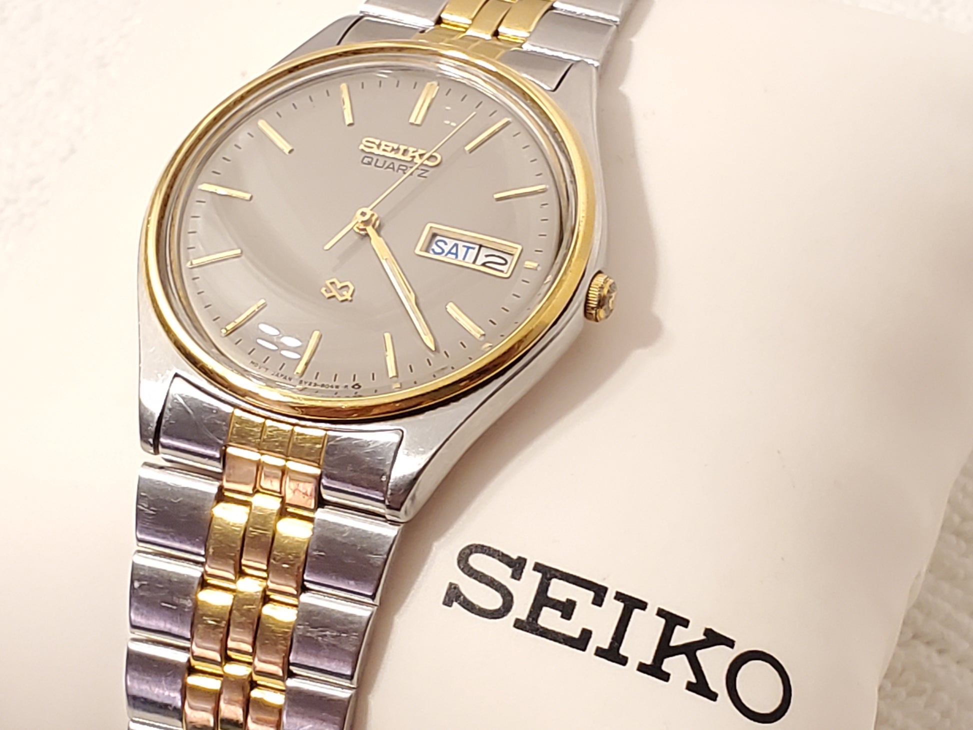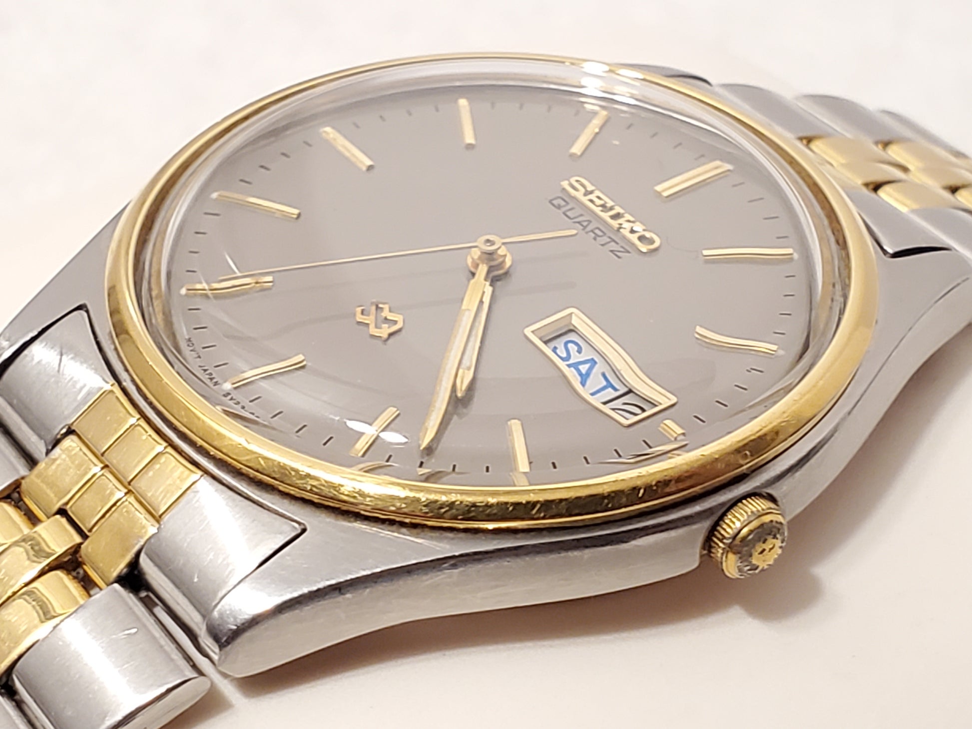 Vintage Seiko SQ Mens Gray Dial Gold Tone Day Date Watch 1 Jewel Stainless Steel