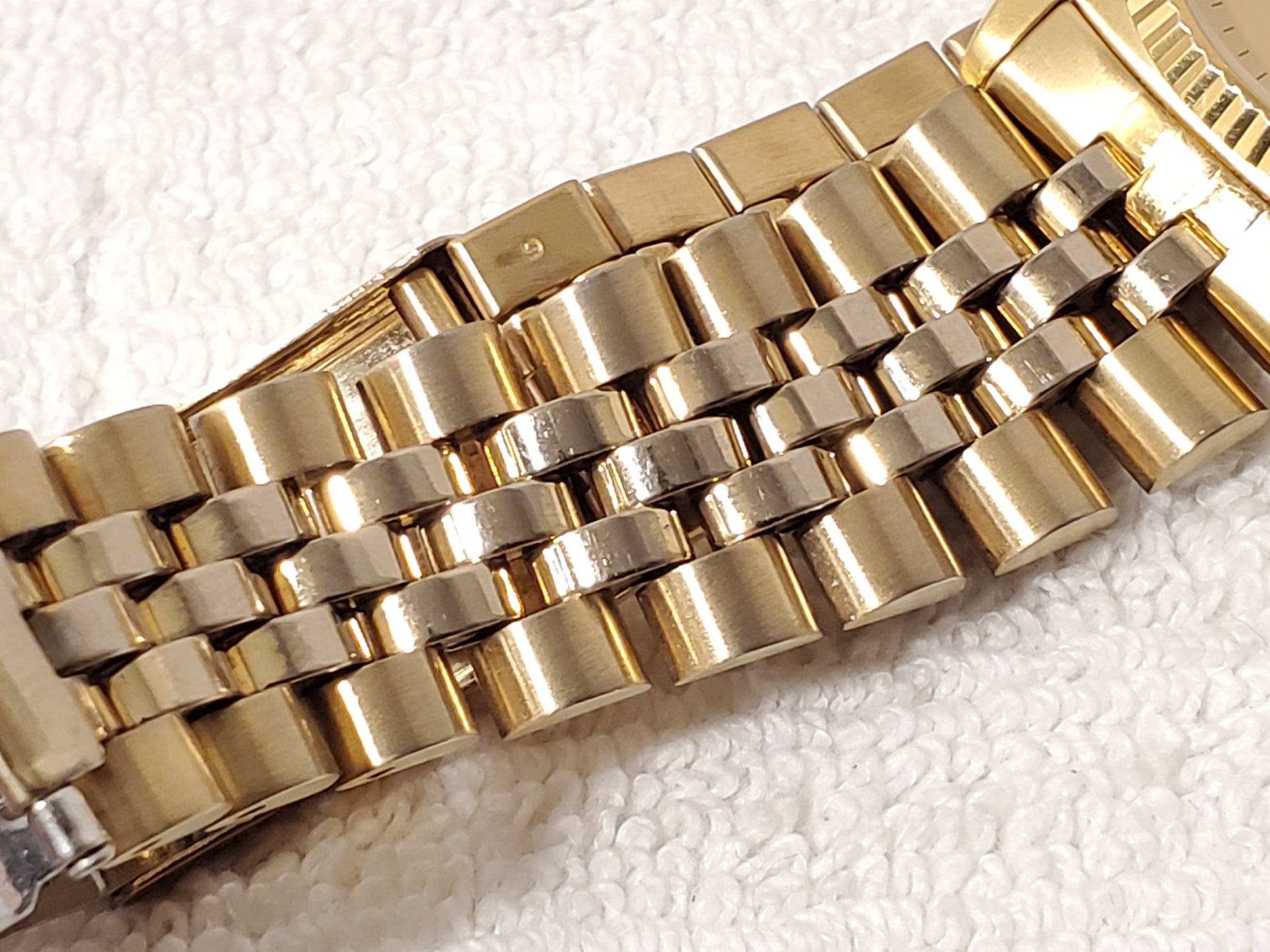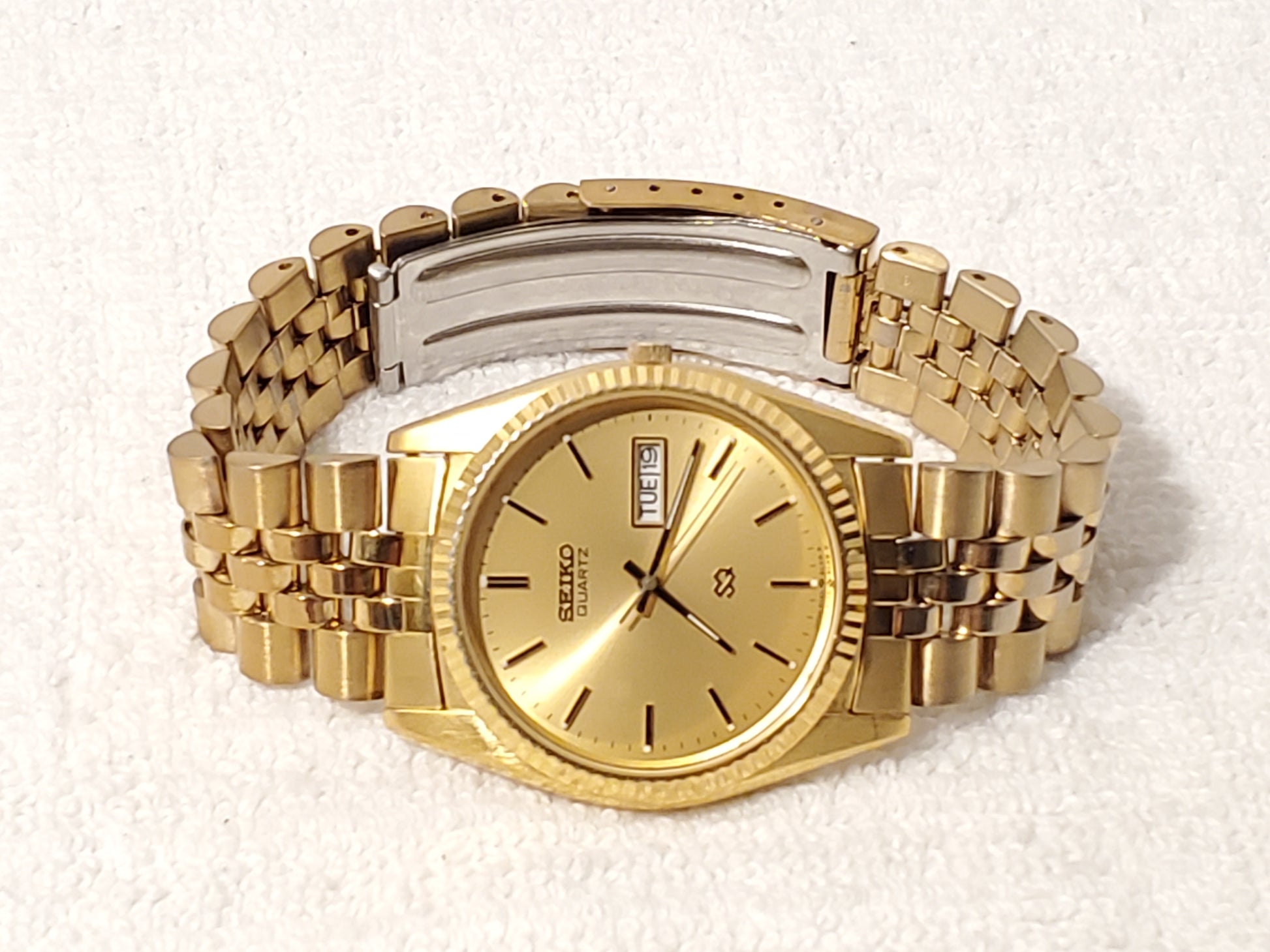 NO SCRATCHES OR SCUFFS ON MINERAL CRYSTAL GLASS WINDOW. ONE OWNER. May see ghost to lite scratches on back plate, bracelet, clasp all minor. Lite fading on one side of bracelet. New ENERGIZER battery installed AUGUST 2025, tested, inspected, and witnessed, everything works, fully functional as manufactured, smoke and pet free, CLEAN, DETAILED, POLISHED, BRIGHT, SHINY, ready to wear. Wrist fit comfortable 7 1/2". Max 7 3/4" tight fit can adjust to fit a smaller size. Photos may be brighter than the original color. Case size 36m, thickness 7m, gold dial, day date indicator, luminous hands and indexes, fixed fluted presidential bezel, screwback plate, jubilee bracelet, one jewel, stainless steel, removable links, micro adjustments, fold over secure snap clasp, vintage 1980's, water resistance 30 meters, Seiko SQ.