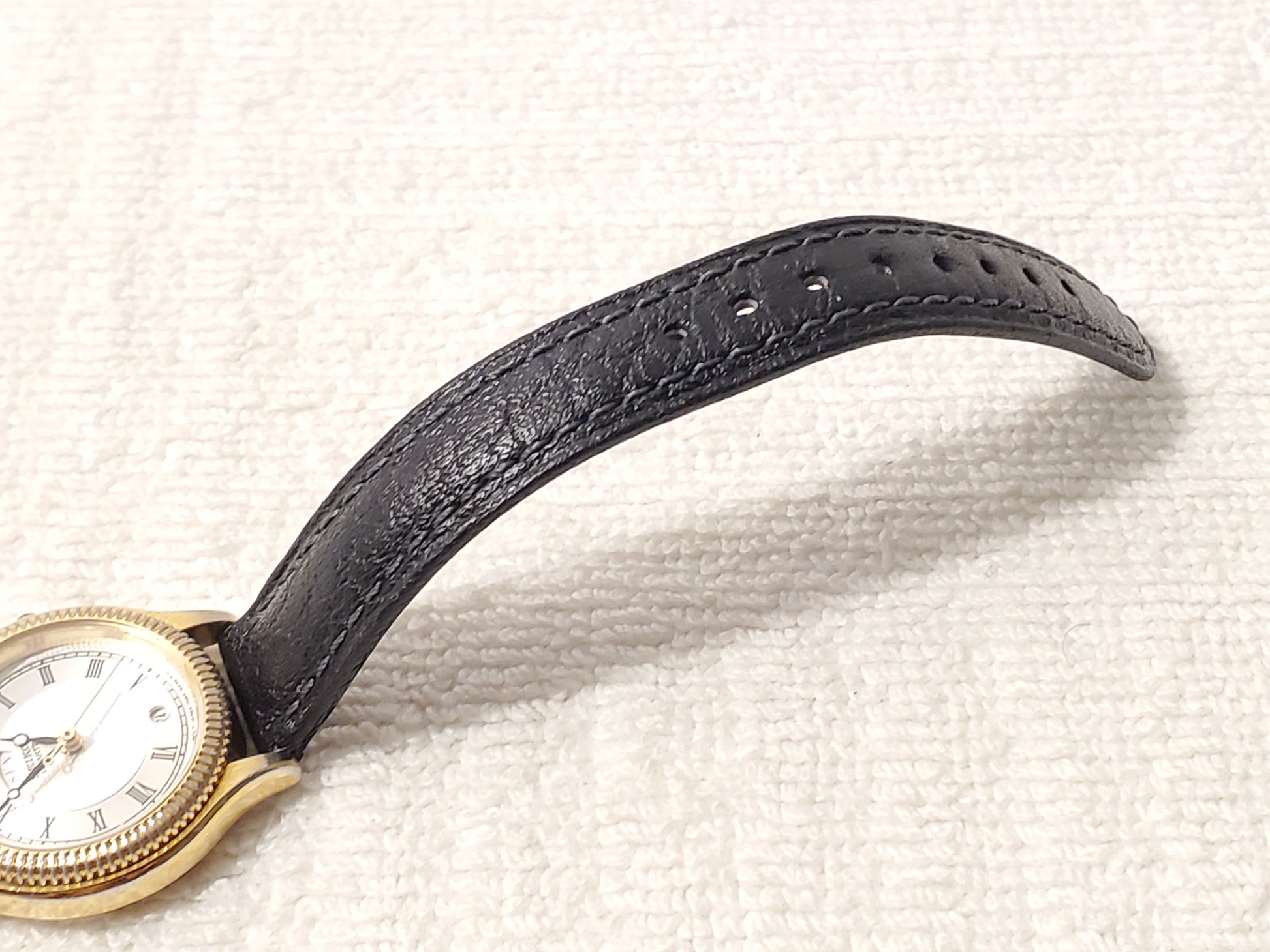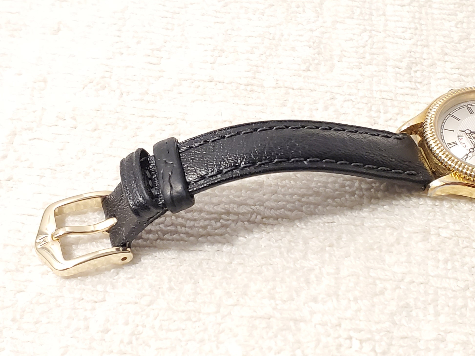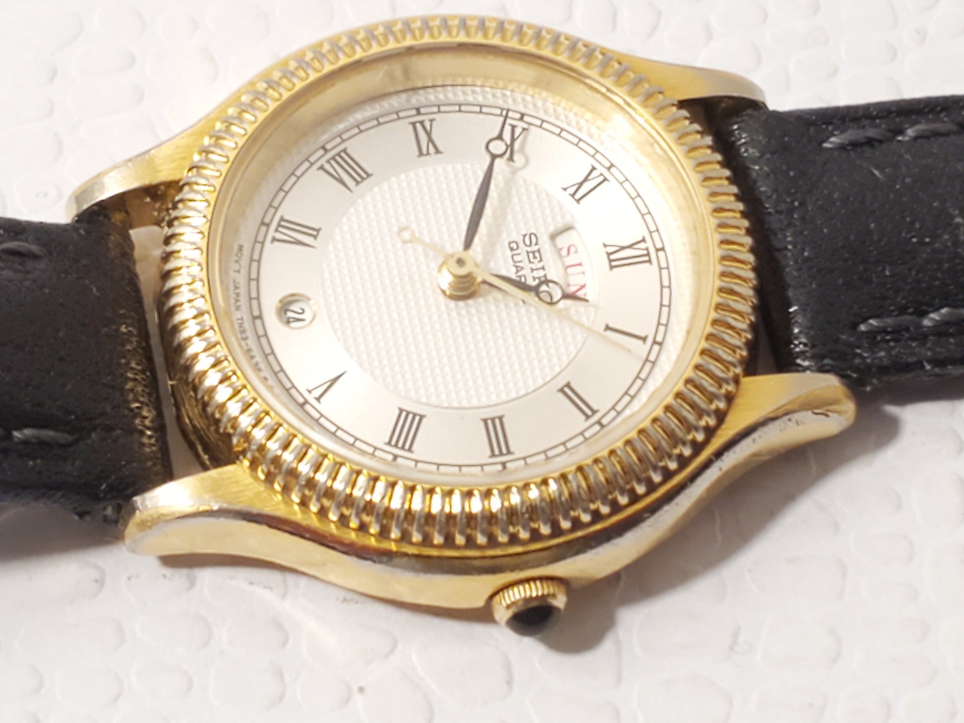 NO SCRATCHES OR SCUFFS ON MINERAL CRYSTAL GLASS WINDOW. May see ghost to lite scratches on back plate all minor. New MAXELL battery installed AUGUST 2025, tested, inspected, and witnessed, everything works, fully functional as manufactured, smoke and pet free, CLEAN, DETAILED, POLISHED, BRIGHT, SHINY, ready to wear. Wrist fit up to 7" max tight fit can adjust to fit a smaller size. Photos may be brighter than the original color. Case size 27m, thickness 7m, silver dial, black roman numerals, day date indicator, gold tone, black onyx tip crown, stainless steel, vintage 1990's, black leather strap, water resistance 30 meters, splash proof.