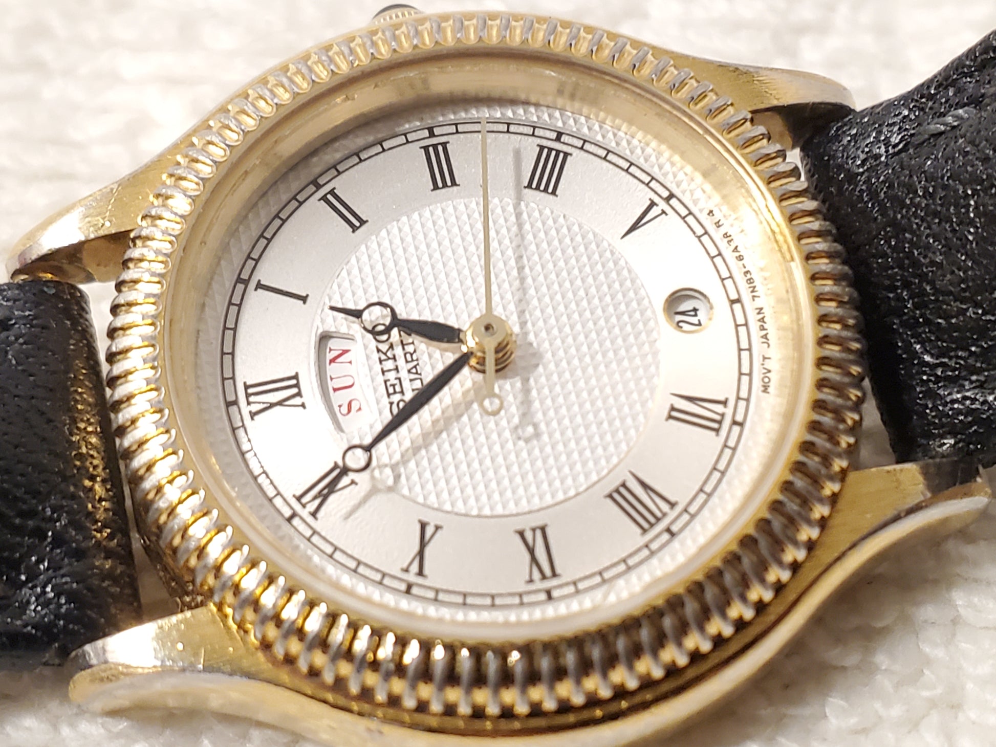 Vintage Seiko Women's Day Date Watch Gold Tone Roman Numerals Black Leather Band