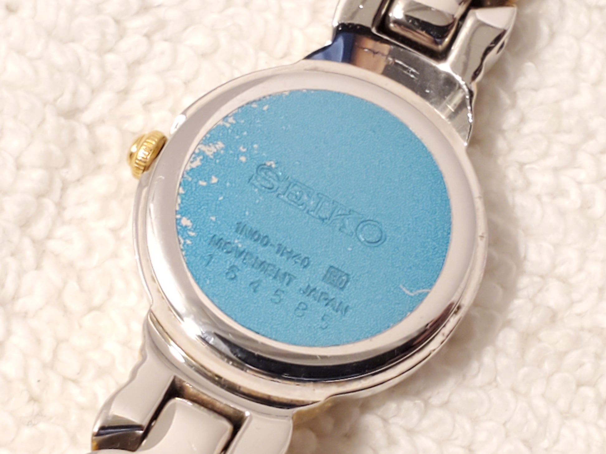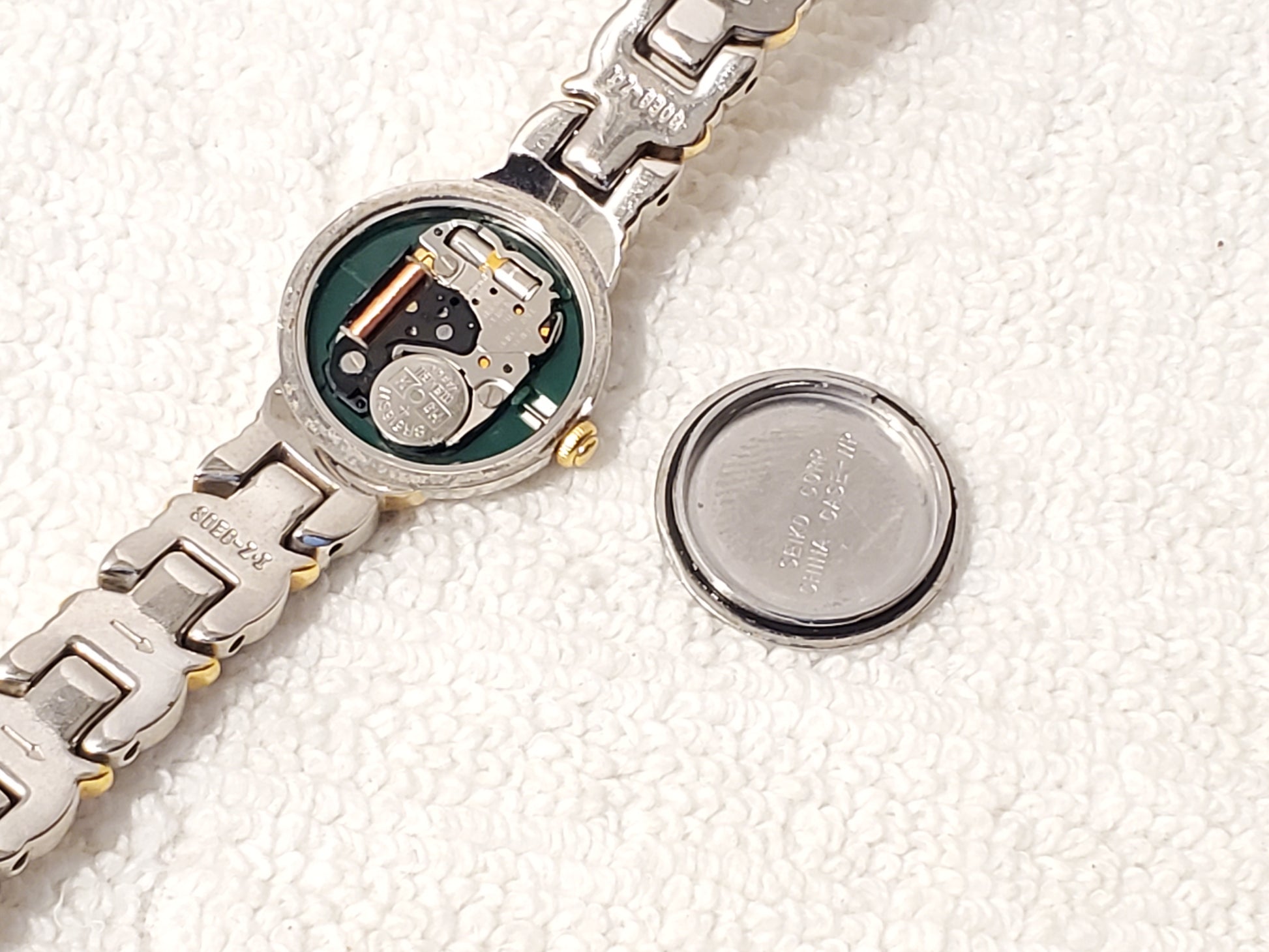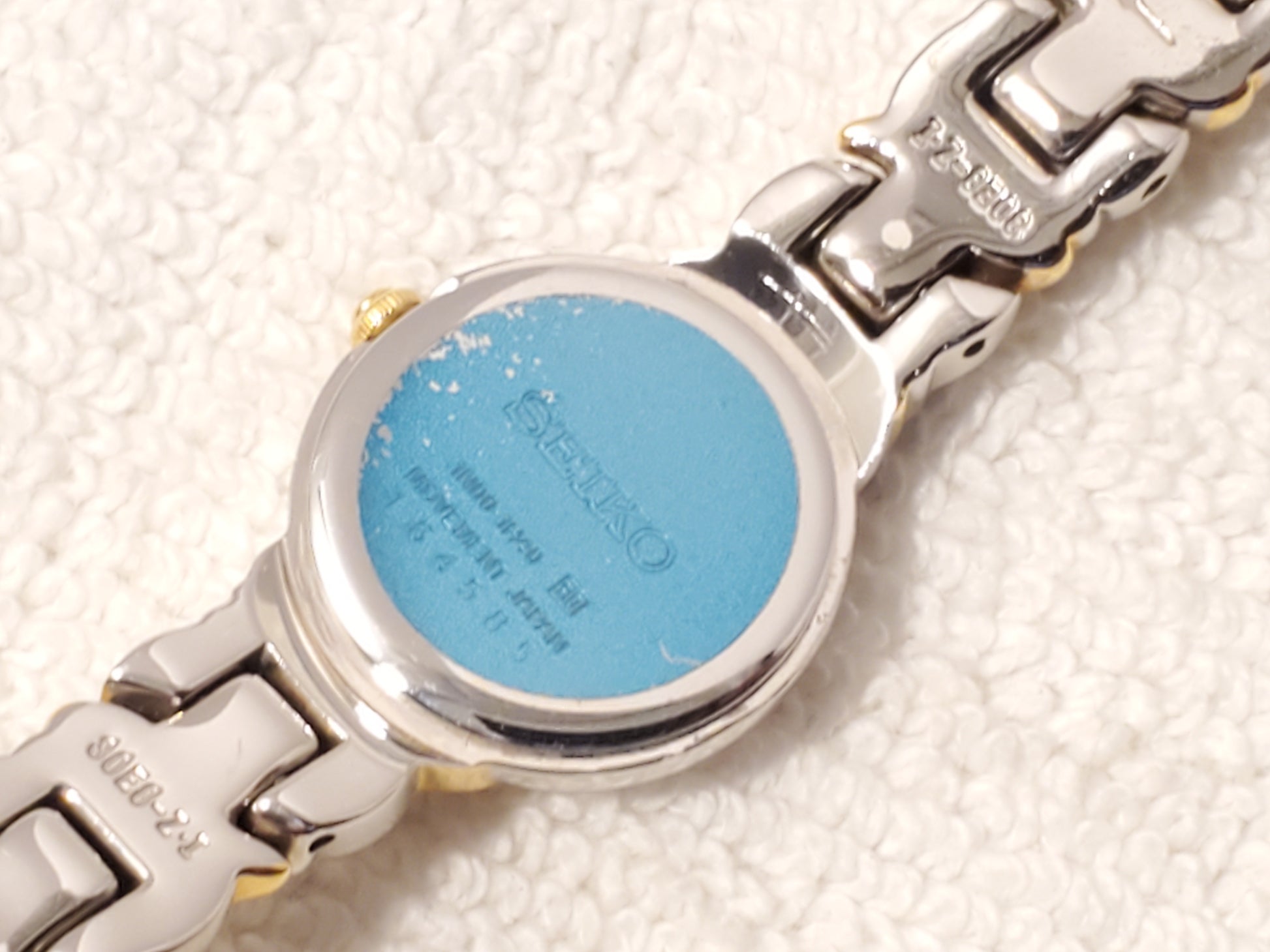 NO SCRATCHES OR SCUFFS ON MINERAL CRYSTAL GLASS WINDOW. ONE OWNER. GENTLY USED. STILL HAS PLASTIC PROTECTOR ON BACK PLATE. VERY GOOD CONDITION COSMETICALLY. New MAXELL battery installed SEPTEMBER 2025, tested, inspected, and witnessed, everything works, fully functional as manufactured, smoke and pet free, CLEAN, DETAILED, POLISHED, BRIGHT, SHINY, ready to wear. Wrist fit comfortable 6 1/2". Max 6 3/4" tight fit can adjust to fit a smaller size. Photos may be brighter than the original color. Case size 19m, thickness 5m, silver dial with diamond, gold tone trim, stainless steel, removable links, jewelry clasp snap, petite, vintage 1990's, Japan Movement.