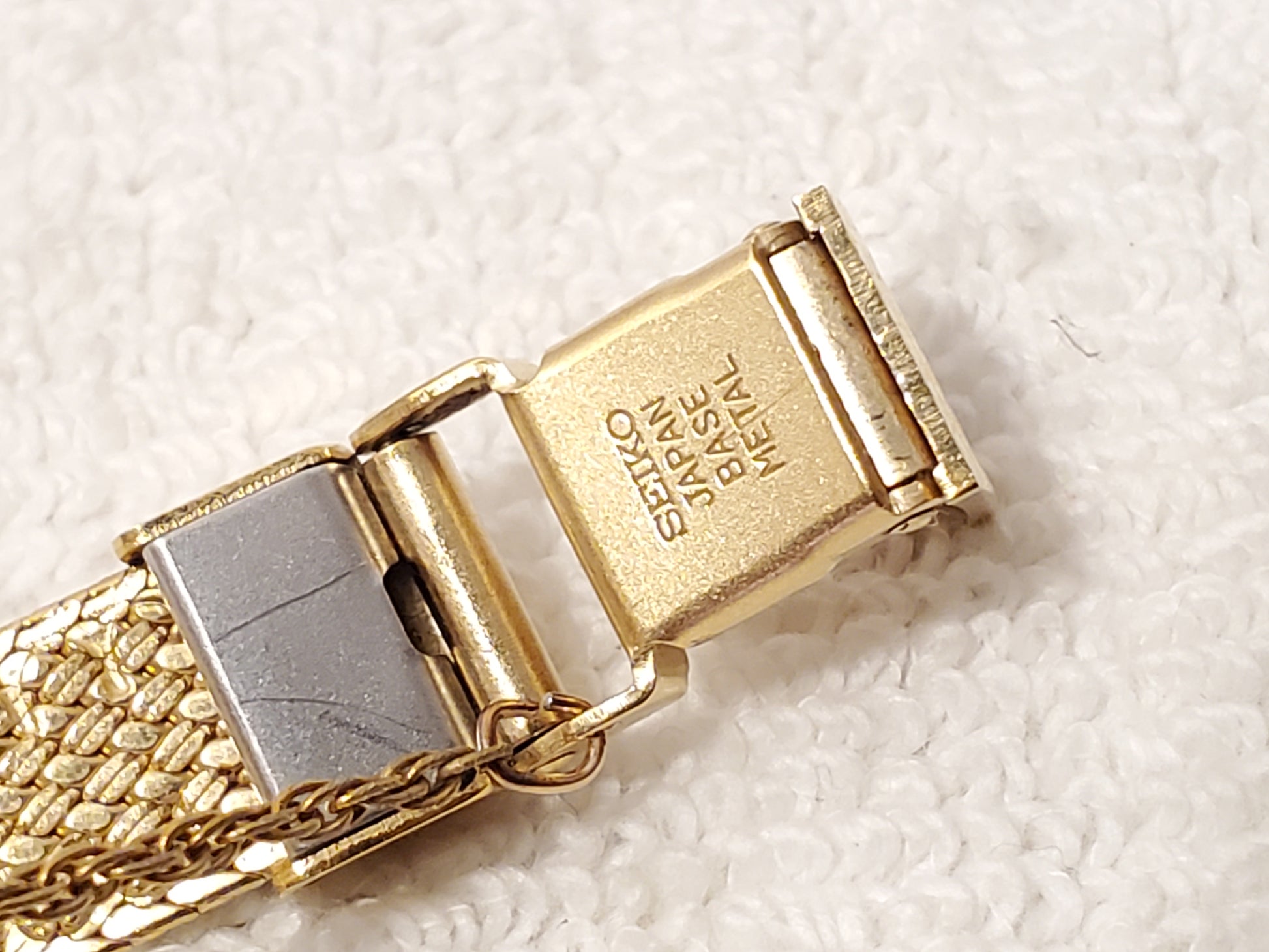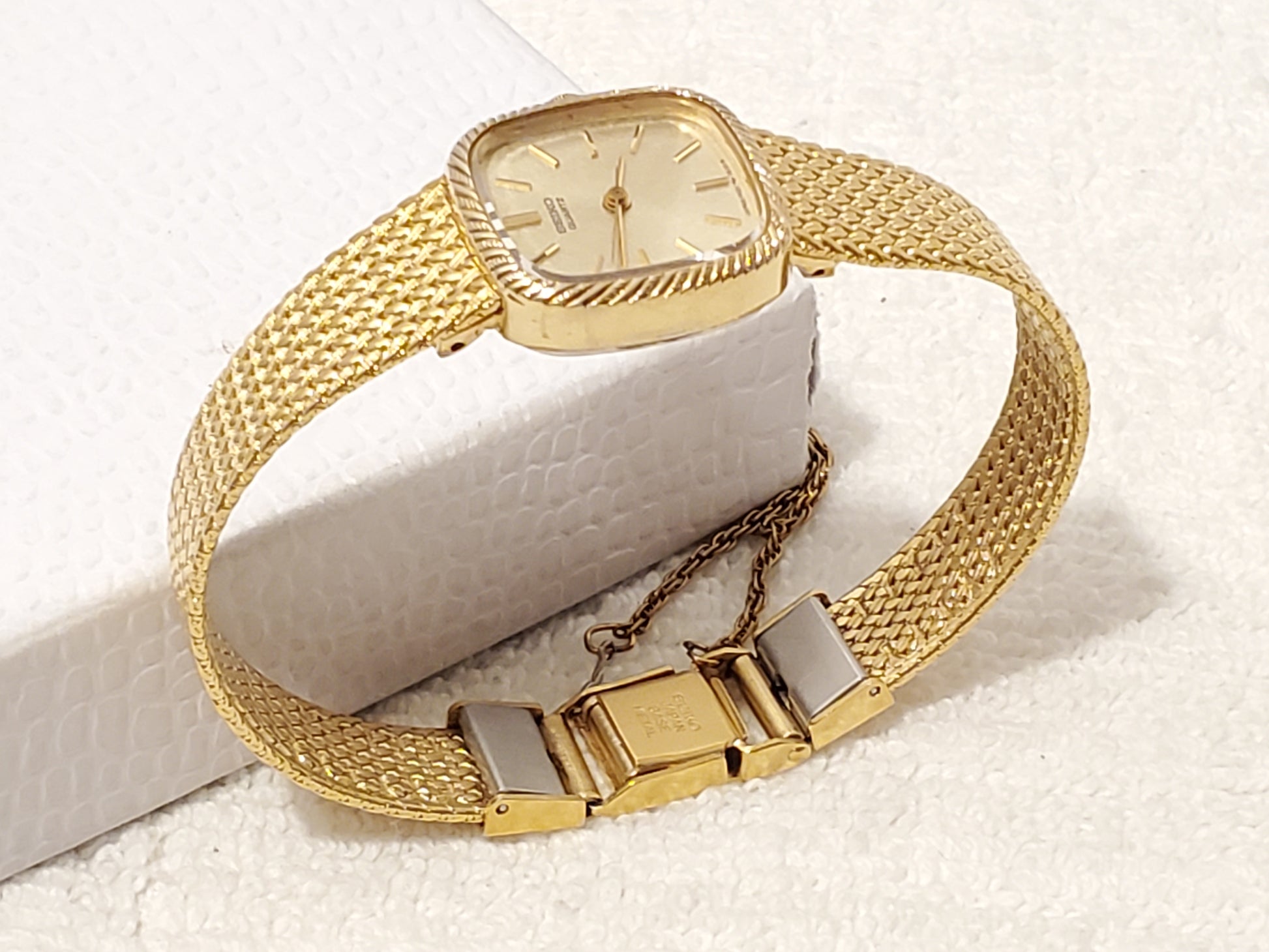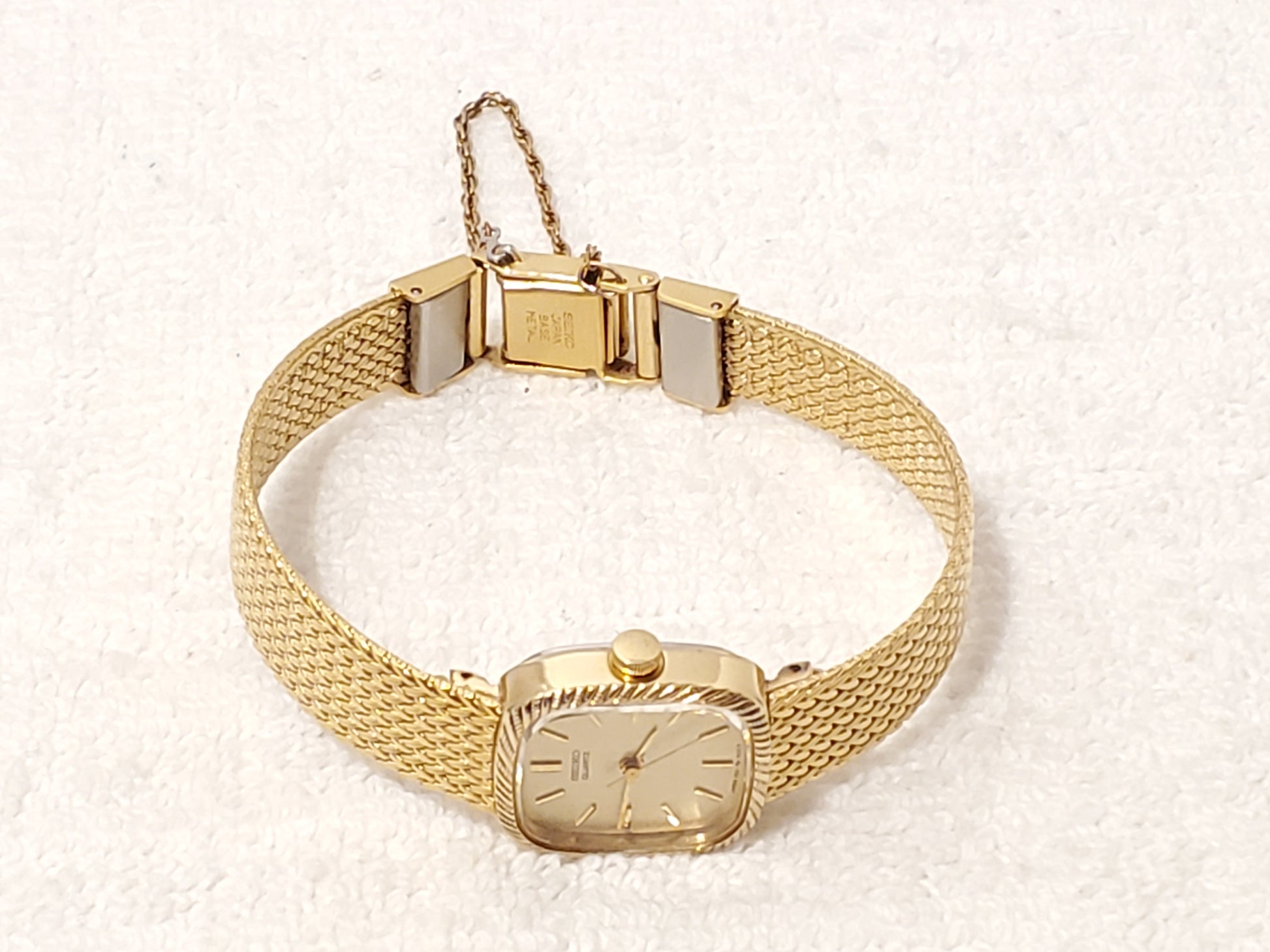 NO SCRATCHES OR SCUFF ON MINERAL CRYSTAL GLASS WINDOW. ONE OWNER. May see ghost to lite scratches on back plate all minor. New ENERGIZER battery installed AUGUST 2025, tested, inspected, and witnessed, everything works, fully functional as manufactured, smoke and pet free, CLEAN, DETAILED, POLISHED, BRIGHT, SHINY, ready to wear. Wrist fit comfortable 6". Max 6 1/4" tight fit can adjust to fit a smaller size. Photos may be brighter than the original color. Case size 19m, thickness 7m, champagne dial, base metal, stainless steel, two jewels, safety dress chain, jewelry clasp, vintage 1980's.