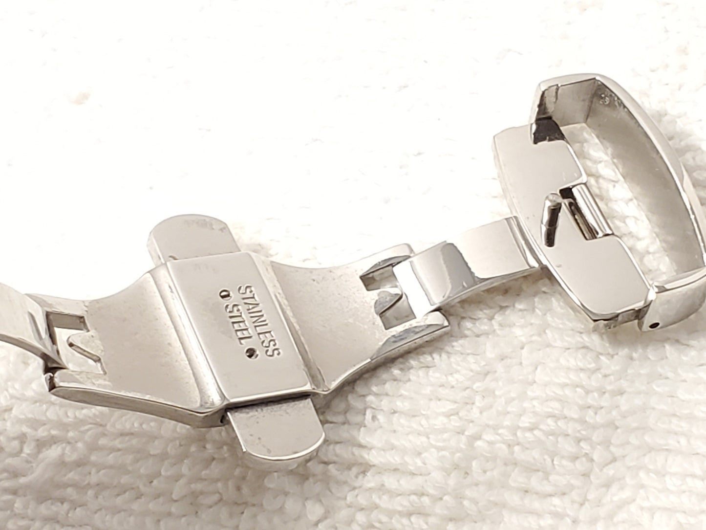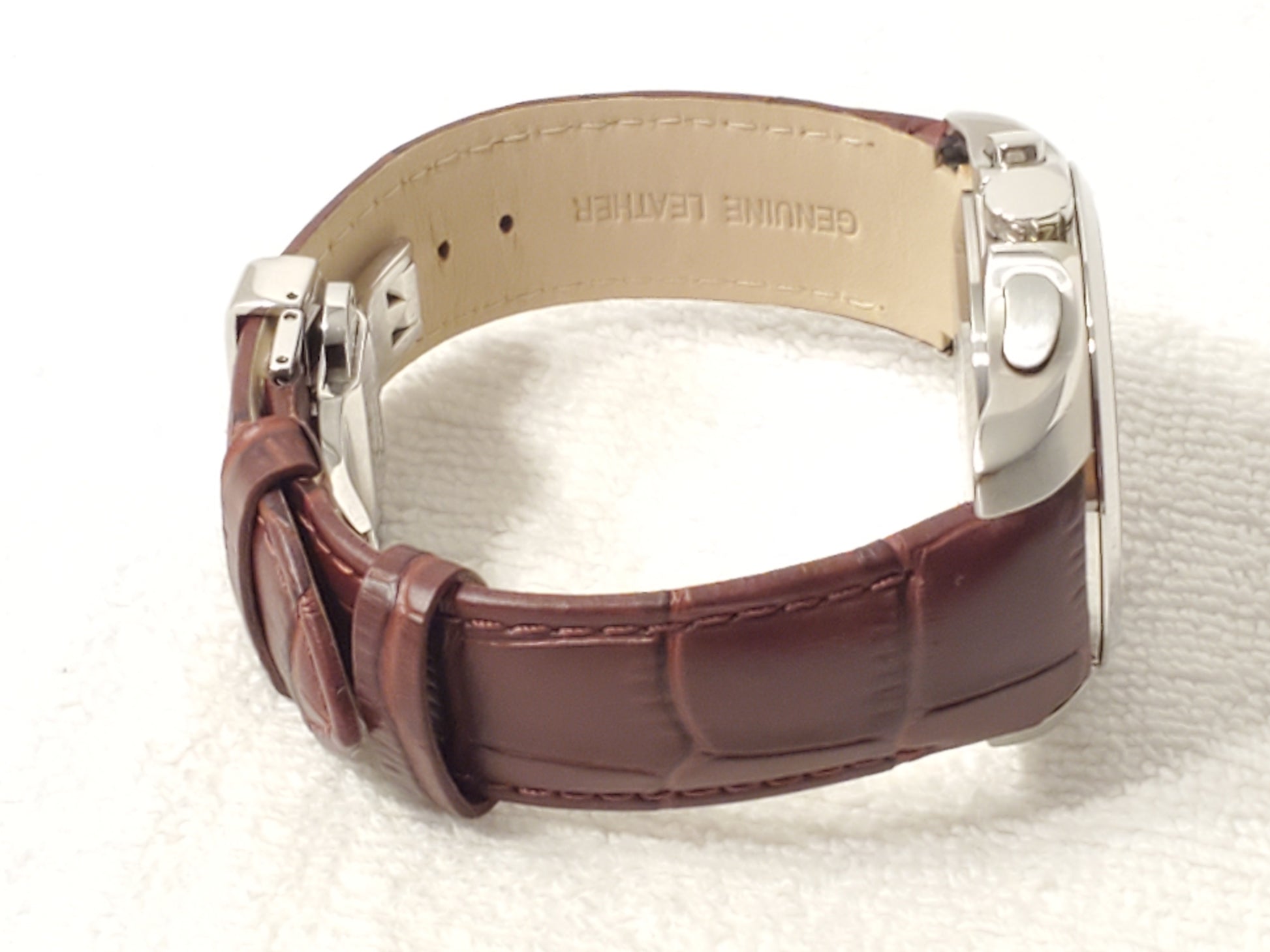 NO SCRATCHES OR SCUFFS ON THICK MINERALCRYSTAL GLASS WINDOW. ONE OWNER. GENTLY USED A FEW TIMES. VERY GOOD CONDITION COSMETICALLY. New ENERGIZER battery installed APRIL 2025, tested, inspected, and witnessed, everything works, fully functional as manufactured, smoke and pet free, CLEAN, DETAILED, POLISHED, BRIGHT, SHINY, ready to wear. Wrist fit up to 8" max tight fit can adjust to fit a smaller size. Photos may be brighter than the original color. Case size 43m, thickness 13m, chronograph, date indicator, luminous hands, silver dial, silver tone, thick brown leather strap, hidden fold clasp push button deploy, water resistance 30 meters.
